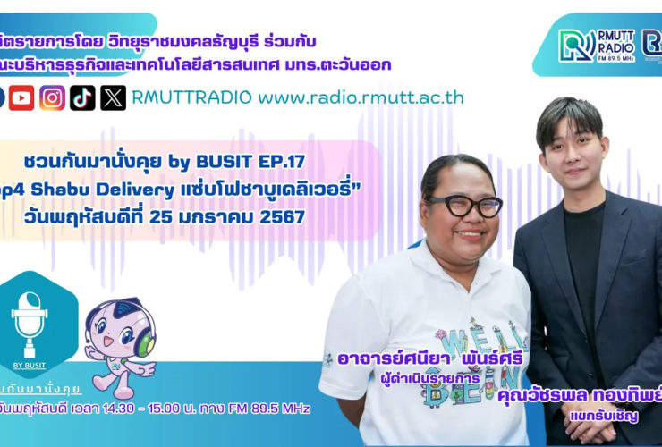 ชวนกันมานั่งคุย BY BUSIT [EP.17] Zap4 Shabu Delivery แซ่บโฟชาบูเดลิเวอรี่ สัปดาห์นี้ อาจารย์ศนียา พันธ์ศรี ชวน คุณวัชรพล ทองทิพย์เจริญ (บอส) ศิษย์เก่า มทร.ตะวันออกที่ประสบความสำเร็จ มาเปิดเส้นทางประสบการณ์ทำงาน สู่ความสำเร็จจนถึงทุกวันนี้ และมาทำความรู้จักแบรนด์ Zap4 Shabu Delivery แซ่บโฟชาบูเดลิเวอรี่ ซึ่งเป็นที่รู้จักบนโลกออนไลน์ รับฟังรายการได้ทาง FM 89.5 MHz วิทยุราชมงคลธัญบุรี ออกอากาศ วันที่ 25 มกราคม 2567 เวลา 14.30 – 15.00 น. ...