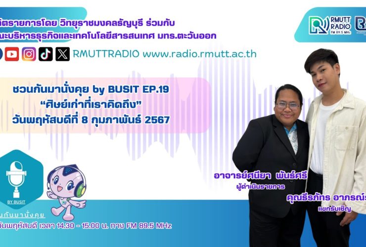 ชวนกันมานั่งคุย BY BUSIT [EP.19] ศิษย์เก่าที่เราคิดถึง สัปดาห์นี้พูดคุยกับศิษย์เก่าที่เราคิดถึง คุณธีรภัทร อาภรณ์รัตน์ ตำแหน่ง Event Creator & Marketing Activity ศิษย์เก่า มทร.ตะวันออก มาเปิดเส้นทางประสบการณ์ทำงาน สู่ความสำเร็จมาจนถึงปัจจุบัน ดำเนินรายการโดย อาจารย์ศนียา พันธ์ศรี รับฟังรายการได้ทาง FM 89.5 MHz วิทยุราชมงคลธัญบุรี ออกอากาศ วันที่ 8 กุมภาพันธ์ 2567 เวลา 14.30 – 15.00 น. ผู้ดำเนินรายการโดย อาจารย์ศนียา พันธ์ศรี ...