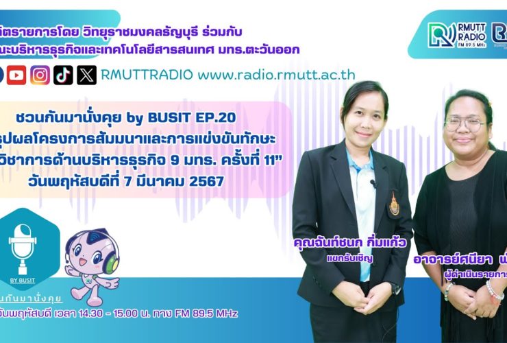 ชวนกันมานั่งคุย BY BUSIT [EP.20] การเตรียมความพร้อมในการเข้าร่วมงานวิชาการ 9 มทร.ครั้งที่ 11 คณะบริหารธุรกิจและเทคโนโลยีสารสนเทศ มทร.ตะวันออก เขตพื้นที่จักรพงษภูวนารถ มีการเตรียมความพร้อมในการเข้าร่วมการแข่งขันในครั้งที่ 11 นี้โดยการรับเรื่องมาจากที่ประชุมใหญ่มาจนถึงคณะเราได้มีการจัดการประชุมแบ่งหน้าที่และกิจกรรมตามความถนัดของอาจารย์แต่ละสาขาและแต่ละบุคคล รับฟังรายการได้ทาง FM 89.5 MHz Innovationforlife วิทยุราชมงคลธัญบุรี ออกอากาศ วันที่ 7 มีนาคม 2567 เวลา 14.30 – 15.00 น. ดำเนินรายการโดย อาจารย์ศนียา พันธ์ศรี แขกรับเชิญ นางสาวฉันชนก กิ่มแก้ว หัวหน้าสำนักงานคณบดีคณะบริหารธุรกิจและเทคโนโลยีสารสนเทศ คณบดีคณะบริหารธุรกิจและเทคโนโลยีสารสนเทศ มทร.ตะวันออก ...