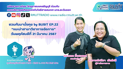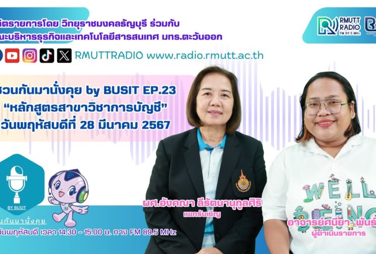 ชวนกันมานั่งคุย BY BUSIT [EP.23] หลักสูตรสาขาวิชาการบัญชี คณะบริหารธุรกิจและเทคโนโลยีสารสนเทศ มทร.ตะวันออก มาพูดคุยถึงหลักสูตรและสาขาวิชาถึงความเป็นมาของสาขาและการเรียนการสอนที่น่าสนใจ จุดเด่น ของสาขาและการเปิดรับสมัครนักศึกษา ในแต่ละครั้งมีหลักเกณฑ์ในการคัดเลือกนักศึกษาทุน โคต้า ต่างๆที่ทางสาขาและคณะมอบให้ บอกถึงผลประกอบการในการส่งนักศึกษาไปสหกิจศึกษาและการฝึกงานผลตอบรับการรับนักศึกษาเข้าทำงานหลังจบการศึกษาที่มีเปอร์เซ็นต์ในการงานทำที่ดี บอกถึงผลสำเร็จในการประกอบวิชาชีพของนักศึกษาที่จบไปและผลงานของนักศึกษาปัจจุบันที่มีผลงานเป็นที่ประจักษ์ รับฟังรายการได้ทาง FM 89.5 MHz Innovationforlife วิทยุราชมงคลธัญบุรี ออกอากาศ วันที่ 28 มีนาคม 2567 เวลา 14.30 – 15.00 น. ดำเนินรายการโดย อาจารย์ศนียา พันธ์ศรี แขกรับเชิญ ผศ.อังคณา ลีรัตนานุกูลศิริ หัวหน้าสาขาวิชาการบัญชี คณะบริหารธุรกิจและเทคโนโลยีสารสนเทศ มหาวิทยาลัยเทคโนโลยีราชมงคลตะวันออก ...