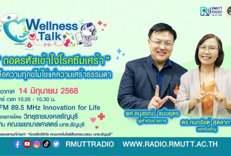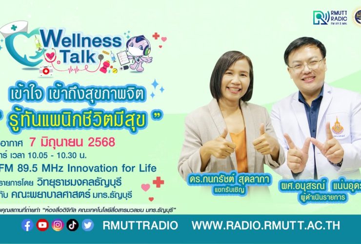 Wellness talk (EP.70) I เข้าใจสุขภาพจิต “รู้ทันแพนิกชีวิตมีสุข” ความเครียด ความวิตกกังวล พฤติกรรมหลายอย่างในชีวิตประจำวัน เป็นส่วนหนึ่งที่กระตุ้นให้เกิดอาการแพนิคได้ เช่น การใช้ชีวิตที่เร่งรีบ ทำงานกับหน้าจอคอมพิวเตอร์หรืออยู่กับมือถือเป็นเวลานาน พักผ่อนน้อย ไม่ออกกำลังกาย หรือต้องเผชิญกับสภาวะกดดัน โรคแพนิค ไม่ได้เป็นโรคร้ายแรง หรือทำให้มีอันตรายถึงชีวิต แต่ทำให้เกิดความกังวลกับผู้ที่เป็น และต้องรักษาหากกระทบกับการใช้ชีวิตประจำวัน ทำให้ไม่สามารถใช้ชีวิตได้โดยปกติ ดำเนินรายการโดย ผศ.อนุสรณ์ แน่นอุดร แขกรับเชิญ อ.ดร.กนกรัชต์ สุดลาภา รับฟังรายการได้ทาง FM 89.5 MHz Innovation for Life วิทยุราชมงคลธัญบุรี วันเสาร์ที่ 7 มิถุนายน 2568 ...