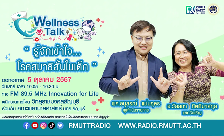 Wellness talk (EP.36) I รู้จักเข้าใจโรคสมาธิสั้นในเด็ก โรคสมาธิสั้นมีลักษณะอยู่ไม่นิ่ง มีปัญหาในการคงสมาธิ และมักพบว่ามีปัญหาในการควบคุมตนเองและเกิด ปัญหาพฤติกรรมต่างๆให้ผู้คนรอบข้างได้ปวดศีรษะได้บ่อยๆ ในปัจจุบันทั้งในวงการแพทย์และวงการการศึกษาได้ให้ความสนใจโรคสมาธิสั้นอย่างจริงจังทำให้มีการศึกษาวิจัยและรวบรวมประสบการณ์ที่เกี่ยวข้องกับเด็กสมาธิสั้น จนเกิดความรู้เกี่ยวกับวิธีการดูแลรักษาและช่วยเหลือเด็กสมาธิสันอย่างมากมาย โดยสามารถนิยามถึงโรคสมาธิสั้น ได้ว่า เป็นกลุ่มอาการที่เป็นความผิดปกติของพัฒนาการ อันเกิดจากความบกพร่องในการทำหน้าที่ของสมอง ทำให้มีปัญหาในการควบคุมตนเอง ทั้งอาการ ชน อยู่ไม่นิ่ง ขาดการยั้งคิดหรือหุนหันพลันแล่น และขาดสมาธิที่ต่อเนื่องโดยพฤติกรรมเหล่านี้มีมากกว่าพฤติกรรมปกติในเด็กวัย เดียวกัน ซึ่งส่งผลทำให้การทำหน้าที่ในการดำเนินชีวิตประจำวันหรือการเข้าสังคมบกพร่องไป ดำเนินรายการโดย ผศ.อนุสรณ์ แน่นอุดร แขกรับเชิญ อ.วัลลภา กิตติมาสกุล รับฟังรายการได้ทาง FM 89.5 MHz Innovation for Life วิทยุราชมงคลธัญบุรี วันเสาร์ที่ 5 ตุลาคม ...