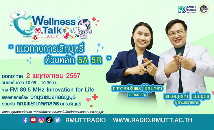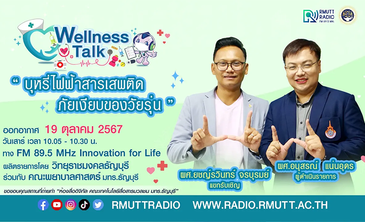 Wellness talk (EP.38) I บุหรี่ไฟฟ้าสารเสพติด ภัยเงียบของวัยรุ่น บุหรี่ไฟฟ้าหรือบุหรี่อิเล็กทรอนิกส์เป็นภัยเงียบที่สำคัญในปัจจุบันของวัยรุ่น จากกลยุทธ์ทางการตลาด เช่น การโฆษณาที่สร้างให้เชื่อว่าการสูบบุหรี่ไฟฟ้าไม่เป็นอันตรายต่อสุขภาพเพราะไม่มีใบยาสูบ อีกทั้งยังสร้างภาพของผู้สูบว่าเป็นคนทันสมัยแต่ในความเป็นจริงกลับพบว่าบุหรี่ไฟฟ้ามีนิโคตินผสมอยู่ในปริมาณมากและสามารถนำเข้าสู่ร่างกายผู้สูบได้มากกว่าการสูบบุหรี่ธรรมดาถึง 5 – 9 เท่า ดำเนินรายการโดย ผศ.อนุสรณ์ แน่นอุดร แขกรับเชิญ ผศ.ยชญ์รวินทร์ จรบุรมย์ รับฟังรายการได้ทาง FM 89.5 MHz Innovation for Life วิทยุราชมงคลธัญบุรี วันเสาร์ที่ 19 ตุลาคม 2567 เวลา 10.05 – 10.30 น. นำเสนอสาระความรู้โดย คณะพยาบาลศาสตร์ ...
