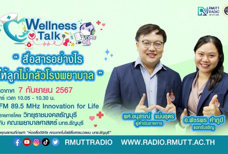 Wellness talk (EP.32) I สื่อสารอย่างไรให้ลูกไม่กลัวโรงพยาบาล เรื่องของการสื่อสารกับเด็ก เพราะว่าเราเจอบ่อยมาก เมื่อเด็กไม่สบายต้องเข้ารับการรักษาในโรงพยาบาล ก็มักจะพบการสื่อสารกับเด็กที่เป็นผลกระทบทางด้านลบ เช่น ขู่เด็ก หลอกเด็ก ทำให้เด็กกลัว หรือทำให้เด็กเข้าใจผิด เกิดขึ้นได้ทั้งจากพ่อแม่ หรือแม้กระทั่งเจ้าหน้าที่ในโรงพยาบาลเอง ดังนั้นสิ่งเหล่านี้จะต้องปรับพฤติกรรมจากผู้ปกครอง พ่อแม่ หรือคนรอบข้าง ควรใช้คำพูดที่ไม่แสดงถึงผลกระทบทางด้านลบ ดำเนินรายการโดย ผศ.อนุสรณ์ แน่นอุดร แขกรับเชิญ อ.พัชรพร คำภูมี รับฟังรายการได้ทาง FM 89.5 MHz Innovation for Life วิทยุราชมงคลธัญบุรี วันเสาร์ที่ 7 กันยายน 2567 เวลา 10.05 ...