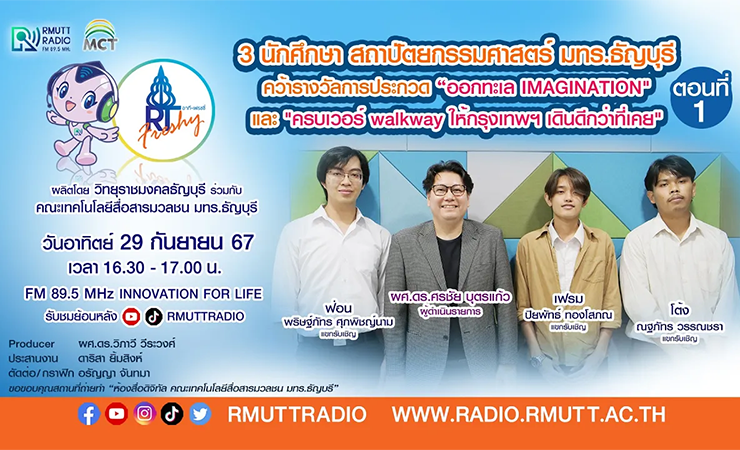 RT Freshy (EP.33) I 3 นักศึกษา สถาปัตยกรรมศาสตร์ มทร.ธัญบุรี คว้ารางวัลการประกวด “ออกทะเล IMAGINATION” และ “ครบเวอร์ walkway ให้กรุงเทพฯ เดินดีกว่าที่เคย” ตอนที่ 1 พูดคุยประสบการณ์ในช่วงก่อนเข้าเรียนต่อระดับปริญญาตรี การปรับตัวในการศึกษาการเรียนการสอนในคณะสถาปัตยกรรมศาสตร์ มทร.ธัญบุรี และการเตรียมความพร้อมการทำกิจกรรมควบคู่ไปกับการเรียน ทั้งนี้ได้เล่าถึงประสบการณ์การนำผลงานส่งไปประกวดภายนอกมหาวิทยาลัย ซึ่งได้รับรางวัลครั้งนี้ด้วย ดำเนินรายการโดย ผู้ช่วยศาสตราจารย์ ดร.ศรชัย บุตรแก้ว สาขาเทคโนโลยีมัลติมีเดีย คณะเทคโนโลยีสื่อสารมวลชน มทร.ธัญบุรี แขกรับเชิญ นายปิยพัทธ์ ทองโสภณ (เฟรม) – นายณฐภัทร วรรณชรา (โต้ง) – ...