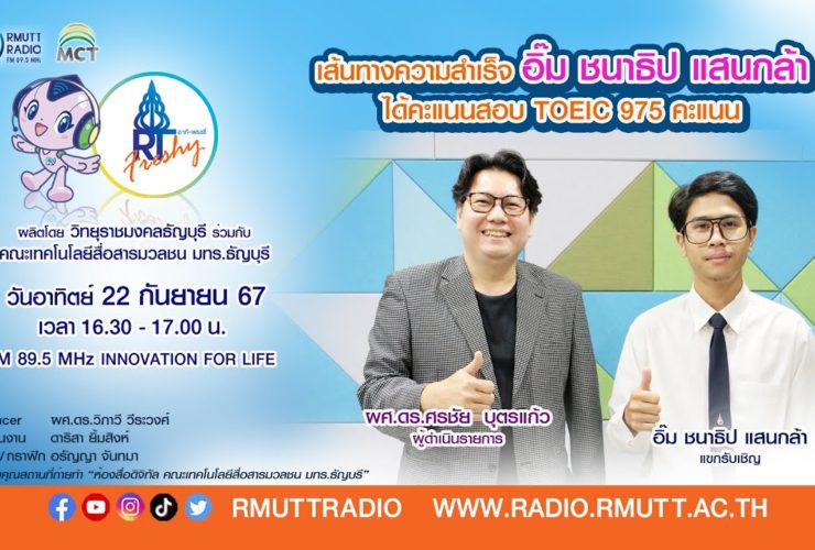RT Freshy (EP.32) I เส้นทางความสำเร็จ อิ๊ม ชนาธิป แสนกล้า ที่ได้คะแนนสอบ TOEIC 975 คะแนน พูดคุยประสบการณ์ในช่วงก่อนเข้าเรียนต่อระดับปริญญาตรี และความรู้สึกที่ได้คะแนนสอบภาษาอังกฤษ TOEIC 975 คะแนน จากคะแนนเต็ม 990 คะแนน ได้รับเงินรางวัล 10000 บาท นอกจากนี้ยังได้รับเงินสนับสนุนค่าสอบ 1500 บาท และยกเว้นการเรียนรายวิชาภาษาอังกฤษ จำนวน 3 วิชา ของ แม็ค ชนาธิป แสนกล้า นักศึกษาหลักสูตรเทคโนโลยีการถ่ายภาพและภาพยนตร์ คณะเทคโนโลยีสื่อสารมวลชน มทร.ธัญบุรี ดำเนินรายการโดย ผู้ช่วยศาสตราจารย์ ดร.ศรชัย ...