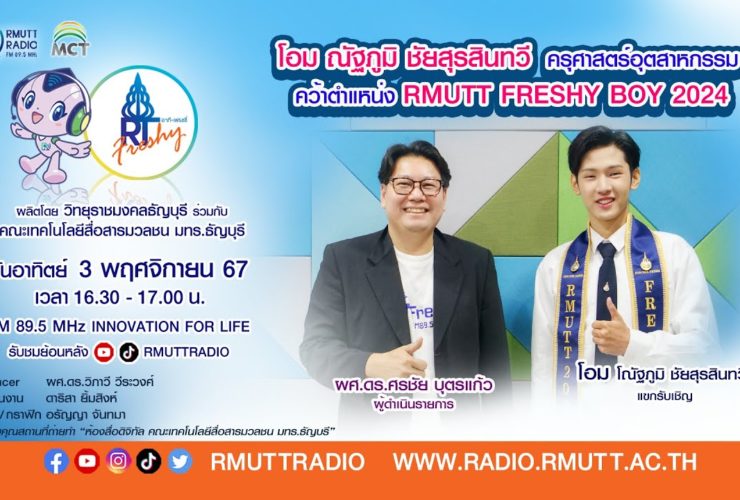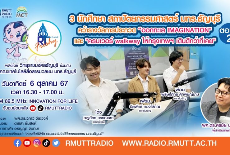 RT Freshy (EP.34) I 3 นักศึกษา สถาปัตยกรรมศาสตร์ มทร.ธัญบุรี คว้ารางวัลการประกวด “ออกทะเล IMAGINATION” และ “ครบเวอร์ walkway ให้กรุงเทพฯ เดินดีกว่าที่เคย” ตอนที่ 2 พูดคุยประสบการณ์ในช่วงก่อนเข้าเรียนต่อระดับปริญญาตรี การปรับตัวในการศึกษาการเรียนการสอนในคณะสถาปัตยกรรมศาสตร์ มทร.ธัญบุรี และการเตรียมความพร้อมการทำกิจกรรมควบคู่ไปกับการเรียน ทั้งนี้ได้เล่าถึงประสบการณ์การนำผลงานส่งไปประกวดภายนอกมหาวิทยาลัย ซึ่งได้รับรางวัลครั้งนี้ด้วย ดำเนินรายการโดย ผู้ช่วยศาสตราจารย์ ดร.ศรชัย บุตรแก้ว สาขาเทคโนโลยีมัลติมีเดีย คณะเทคโนโลยีสื่อสารมวลชน มทร.ธัญบุรี แขกรับเชิญ นายปิยพัทธ์ ทองโสภณ – นายณฐภัทร วรรณชรา – นายพริษฐ์ภัทร ศุภพิชญ์นาม ...