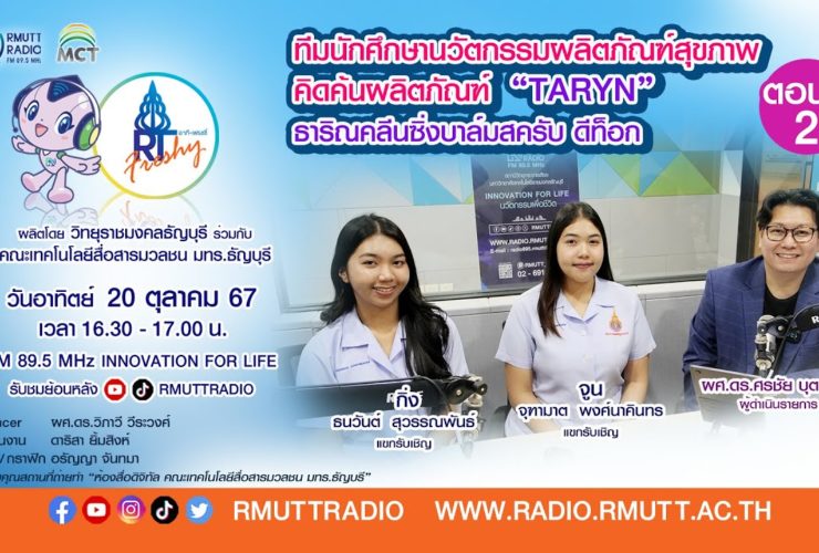 RT Freshy (EP.36) I ทีมนักศึกษานวัตกรรมผลิตภัณฑ์สุขภาพ คิดค้นผลิตภัณฑ์ TARYN ธาริณคลีนซิ่งบาล์มสครับ ดีท็อก ตอนที่ 2 พูดคุยประสบการณ์ในช่วงก่อนเข้าเรียนต่อระดับปริญญาตรี การปรับตัวในการศึกษาการเรียนการสอนใน สาขานวัตกรรมผลิตภัณฑ์สุขภาพ คณะการแพทย์บูรณาการ มทร.ธัญบุรี และการขั้นตอนการคิดค้นนวัตกรรมใหม่ ให้ตอบโจทย์ผู้ใช้ในปัจจุบัน ซึ่งอยู่ในแบรนด์ TARYN ธาริณคลีนซิ่งบาล์มสครับ ดีท็อก ซึ่งได้รับรางวัล Gold Medal และ รางวัลพิเศษ Laeding Innovation Awards จาก Macao Innovation and Invention Association (MIIA) ร่วมถึงเล่าประสบการณ์การไปฝึกงานในองค์กรที่ติดระดับได้มาตรฐานสากลอีกด้วย ดำเนินรายการโดย ผู้ช่วยศาสตราจารย์ ...