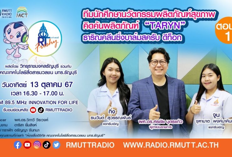 RT Freshy (EP.35) I ทีมนักศึกษานวัตกรรมผลิตภัณฑ์สุขภาพ คิดค้นผลิตภัณฑ์ TARYN ธาริณคลีนซิ่งบาล์มสครับ ดีท็อก ตอนที่ 1 พูดคุยประสบการณ์ในช่วงก่อนเข้าเรียนต่อระดับปริญญาตรี การปรับตัวในการศึกษาการเรียนการสอนใน สาขานวัตกรรมผลิตภัณฑ์สุขภาพ คณะการแพทย์บูรณาการ มทร.ธัญบุรี และการขั้นตอนการคิดค้นนวัตกรรมใหม่ ให้ตอบโจทย์ผู้ใช้ในปัจจุบัน ซึ่งอยู่ในแบรนด์ TARYN ธาริณคลีนซิ่งบาล์มสครับ ดีท็อก ซึ่งได้รับรางวัล Gold Medal และ รางวัลพิเศษ Laeding Innovation Awards จาก Macao Innovation and Invention Association (MIIA) ร่วมถึงเล่าประสบการณ์การไปฝึกงานในองค์กรที่ติดระดับได้มาตรฐานสากลอีกด้วย ดำเนินรายการโดย ผู้ช่วยศาสตราจารย์ ...