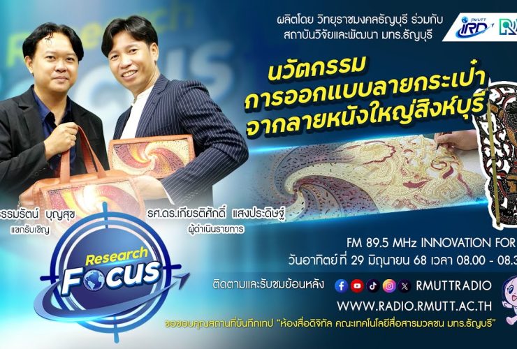 RESEARCH FOCUS [EP.30] นวัตกรรมงานสร้างสรรค์การพัฒนาออกแบบลวดลายหนังใหญ่เพื่อการแปรรูปผลิตภัณฑ์กระเป๋าหนังสุภาพสตรีจังหวัดสิงห์บุรี การสร้างสรรค์ผลงานครั้งนี้กำหนดวัตถุประสงค์ไว้ 4 ประการดังนี้ 1) เพื่อศึกษาลวดลาย สีสัน และเทคนิคการทำหนังใหญ่ 2) เพื่อศึกษาเทคนิคการทำลวดลายหนังใหญ่บนแผ่นหนัง 3) เพื่อออกแบบลวดลายหนังใหญ่สำหรับกระเป๋าหนังสุภาพสตรี 4) เพื่อสร้างสรรค์ต้นแบบผลิตภัณฑ์กระเป๋าหนังสำหรับสุภาพสตรี สร้างสรรค์ผลิตภัณฑ์ต้นแบบประเภทกระเป๋าหนังสำหรับสุภาพสตรีลวดลายหนังใหญ่ 1 ชุด จำนวน 3 ใบ ประกอบด้วย กระเป๋าคลัตช์ (Clutch) 1 ใบ กระเป๋าคล้ายตัวยู (Saddle Bag) 1 ใบ กระเป๋าใบใหญ่มีหูหิ้ว และสายสะพาย (Duffel Bag) 1 ใบ รับฟังรายการได้ทาง ...