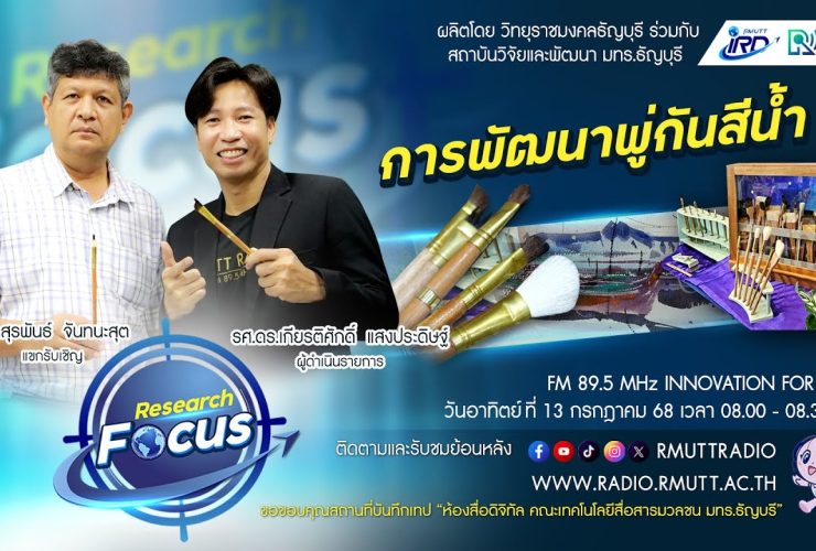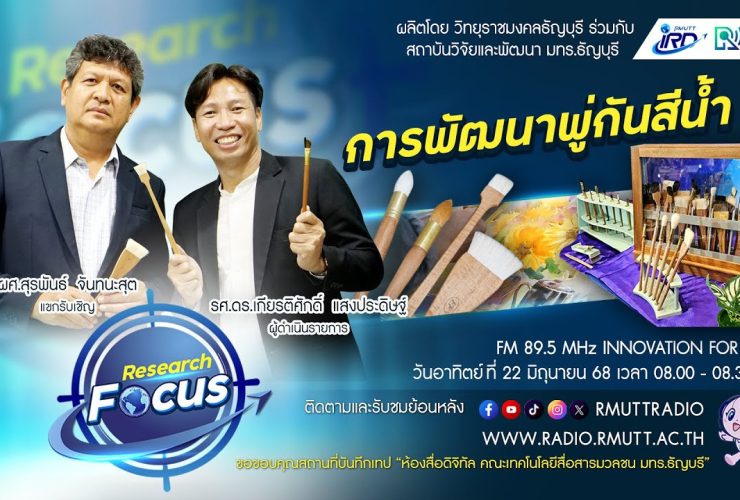 RESEARCH FOCUS [EP.29] การพัฒนาพู่กันสีน้ำ ตอนที่ 2 จุดเด่น เป็นพู่กันที่ออกแบบมาเพื่อการเขียนภาพสีน้ำโดยเฉพาะความต้องการเช่นพู่กันเขียนภาพตันไม้ พู่กันเขียนภาพเรือ เป็นตัน มีนวัตกรรมที่มีการใช้หลักการทางด้านฟิสิกส์ออกแบบให้ด้ามพู่กันจับถนัดมือ กระทัดรัด มีความสมดุลย์ในการใช้งาน ศิลปินมืออาชีพพู่กันที่ผ่านกระบวนการทดสอบจากศิลปินระดับโลกทําให้ได้คุณภาพของพู่กันระบายสีน้ำตลอดจน การปรับปรุงและพัฒนาการขั้นสูงขึ้นไปอย่างต่อเนื่องทั้งในด้านคุณภาพของตัวผลิตภัณฑ์และในด้านเชิงพาณิชย์งานวิจัยได้มีการจดสิทธิบัตร และได้ตีพิมพ์และเผยแพร่ในวารสารวิจัยระดับนานาชาติ เพื่อเป็นการประกันคุณภาพของงานวิจัยและผลิตภัณฑ์พู่กันระบายสีน้ำที่ได้จากการวิจัยโดยผ่านกระบวนการและการทดสอบอย่างเข้มข้นจากบรรดาศิลปินชั้นแนวหน้า รับฟังรายการได้ทาง FM 89.5 MHz Innovationforlife วิทยุราชมงคลธัญบุรี ออกอากาศ วันที่ 22 มิถุนายน 2568 เวลา 08.00 – 08.30 น. ผู้ดำเนินรายการโดย รศ.ดร.เกียรติศักดิ์ แสงประดิษฐ์ ผู้อำนวยการสถาบันวิจัยและพัฒนา มทร.ธัญบุรี แขกรับเชิญ ผศ.สุรพันธ์ ...