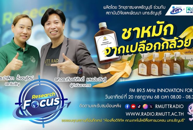 🎞 RESEARCH FOCUS [EP.33] ชาหมักจากเปลือกกล้วย ชาหมักจากเปลือกกล้วย หรือคอมบูชาจากเปลือกกล้วย ผลิตจากเปลือกกล้วยคั่ว และอบแห้ง ซึ่งเป็นแหล่งของสารต้านอนุมูลอิสระ หมักกับจุลินทรีย์สองชนิด ได้แก่ ยีสต์และแบคทีเรีย เรียกว่า symbiotic culture of bacteria and yeast (SCOBY) ซึ่งยีสต์สามารถเปลี่ยนน้ำตาลเป็นแอลกอฮอล์ ซึ่งกระตุ้นให้แบคทีเรียกรดอะซิติกเจริญเติบโตและเปลี่ยนแอลกอฮอล์เป็นกรดอะซิติก กระบวนการหมักส่งผลให้ยังคงคุณค่าของสารอาหารจากเปลือกกล้วย และสนับสนุนประโยชน์ที่เกิดขึ้นจากคอมบูชา รับฟังรายการได้ทาง FM 89.5 MHz Innovationforlife วิทยุราชมงคลธัญบุรี ออกอากาศ วันที่ 20 กรกฎาคม 2568 เวลา 08.00 – 08.30 ...
