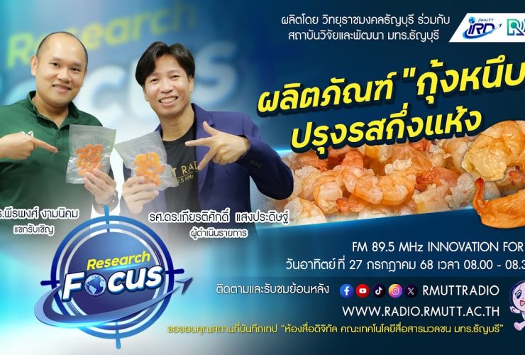 RESEARCH FOCUS [EP.34] ผลิตภัณฑ์ “กุ้งหนึบ” ปรุงรสกึ่งแห้ง ผลิตภัณฑ์พร้อมบริโภคที่พัฒนาขึ้นด้วยกระบวนการออสโมติกดีไฮเดรชันและการอบแห้ง ใช้สารที่ช่วยปรับปรุงคุณภาพในด้านเนื้อสัมผัส รวมทั้งใช้สารฮิวแมคแตนท์ เพื่อลดปริมาณน้ำอิสระ และใช้ภาวะสุญญากาศเพื่อลดปริมาณออกซิเจนที่มีผลต่อการเกิดกลิ่นหืนและช่วยยืดอายุการเก็บรักษา ผลิตภัณฑ์กุ้งปรุงรสกึ่งแห้งมีค่า Aw อยู่ในช่วง 0.6 – 0.7 ซึ่งจัดเป็นอาหารประเภทกึ่งแห้ง สามารถจัดเป็นอาหารว่างที่โปรตีนสูง 30 – 40 g/100g มีกลิ่นและรสชาติเฉพาะตัวของกุ้ง มีเนื้อสัมผัสที่ใกล้เคียงกุ้งสุกมากกว่ากุ้งแห้ง รสชาติของผลิตภัณฑ์นี้สามารถปรับเปลี่ยนได้ตามความต้องการ การเก็บรักษาได้ที่อุณหภูมิห้อง ประมาณ 3 – 4 เดือน ในที่เเห้ง ไม่โดนเเสงแดด และเก็บได้นานขึ้นเมื่อเเช่เย็น หรือเเช่เยือกแข็ง รับฟังรายการได้ทาง FM 89.5 MHz ...