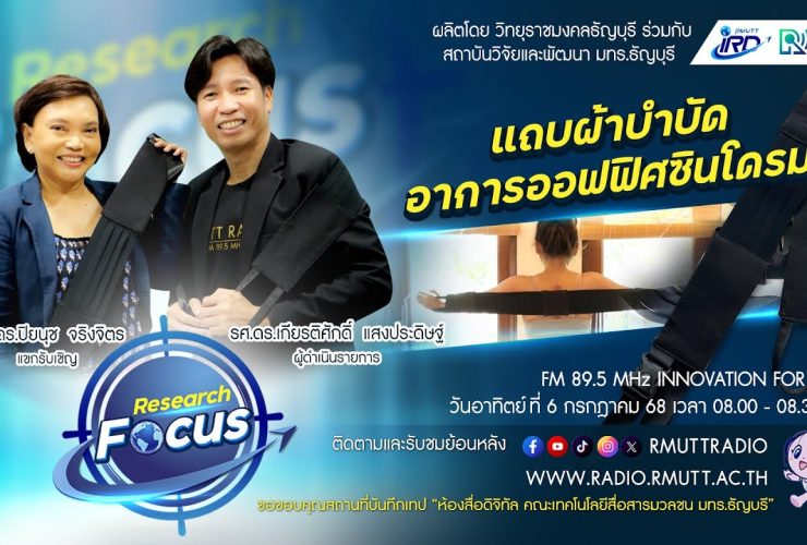RESEARCH FOCUS [EP.31] แถบผ้าบำบัดอาการออฟฟิศซินโดรม แถบผ้าบำบัดประกอบด้วยส่วนผ้าเนื้อแข็งแรง 3 ส่วนซึ่งเชื่อมชิ้นส่วนทั้งหมดเข้าด้วยกัน ทำให้มีความแข็งแรงและมั่นคง ระหว่างชิ้นผ้าแทรกด้วยส่วนประกอบที่มีความยืดตัวสูง แต่ก็มีแรงต้านการยืดตัวในระดับที่เหมาะสม แถบผ้ามีความยืดหยุ่นขณะเคลื่อนไหว ที่ปลายแต่ละด้านของแถบผ้ามีที่จับตามหลักสรีรศาสตร์ ช่วยให้จับและปรับได้ง่าย เพิ่มความสะดวกสบายและควบคุมการใช้งานของผู้ใช้ตลอดการใช้งานเพื่อการบำบัด รับฟังรายการได้ทาง FM 89.5 MHz Innovationforlife วิทยุราชมงคลธัญบุรี ออกอากาศ วันที่ 6 กรกฎาคม 2568 เวลา 08.00 – 08.30 น. ผู้ดำเนินรายการโดย รศ.ดร.เกียรติศักดิ์ แสงประดิษฐ์ ผู้อำนวยการสถาบันวิจัยและพัฒนา มทร.ธัญบุรี แขกรับเชิญ ผศ.ดร.ปิยนุช จริงจิตร นักวิจัยคณะวิศวกรรมศาสตร์ ...