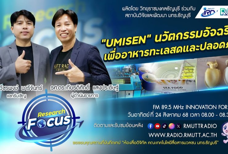 UMISEN : นวัตกรรมอัจฉริยะเพื่ออาหารทะเลสดและปลอดภัย เป็นการผสมผสานเทคโนโลยีสมัยใหม่สองเทคโนโลยีที่มีประสิทธิภาพสูงในการกำจัดสารเคมีอันตรายและยับยั้งการเจริญเติบโตของเชื้อจุลินทรีย์ก่อโรค ยืดอายุการเก็บรักษา และคงความสดใหม่ของอาหารทะเลได้มากกว่า 7 วัน ซึ่งดีกว่าเทคโนโลยีที่มีอยู่เดิมที่รักษาความสดใหม่ได้เพียงแค่ 1-2 วัน และยังเป็นมิตรกับสิ่งแวดล้อม ใช้พลังงานต่ำ ที่สำคัญปลดปล่อยคาร์บอนน้อยกว่าหลอดยูวีและโอโซนเป็นอย่างมาก เนื่องจากใช้พลังงานต่ำและลดการใช้สารเคมี เหมาะสำหรับธุรกิจที่มุ่งเน้นความยั่งยืนและลดผลกระทบต่อสิ่งแวดล้อมในระยะยาว รับฟังรายการได้ทาง FM 89.5 MHz Innovationforlife วิทยุราชมงคลธัญบุรี ออกอากาศ วันที่ 24 สิงหาคม 2568 เวลา 08.00 – 08.30 น. ผู้ดำเนินรายการโดย รศ.ดร.เกียรติศักดิ์ แสงประดิษฐ์ ผู้อำนวยการสถาบันวิจัยและพัฒนา มทร.ธัญบุรี แขกรับเชิญ นายวัชรพงษ์ นารีจันทร์ ...