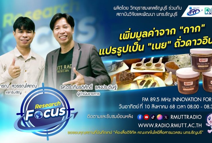 RESEARCH FOCUS [EP.35] เพิ่มมูลค่าจาก “กาก” แปรรูปเป็น “เนย” ถั่วดาวอินคา โครงการการพัฒนาเนยถั่วจากกากถั่วดาวอินคาแบ่งขั้นตอบการพัฒนาเป็น 4 ส่วน ประกอบด้วย ขั้นตอนการวิเคราะห์กากถั่วดาวอินคาหลังจากการสกัดน้ำมัน ขั้นตอนการกำหนดสูตรต้นแบบในการทำเนยถั่วจากากาถั่วดาวอินคา ขั้นตอนการพัฒนาเป็นสูตรต้นแบบเนยถั่วจากกากถั่วดาวอินคาและขั้นตอนการพัฒนาเพื่อให้เนยถั่วดาวอินคาเป็นสูตรพร้อมผลิต ทั้งนี้ผลการพัฒนาได้สูตรเนยถั่วจากกากถั่วดาวอินคาคือ กากถั่วดาวอินคา 29.92% น้ำมันถั่วดาวอินคา 4.94% เนยขาว 4.49% น้ำตาลทราย 10.47% น้ำตาลปี๊บมะพร้าว 5.98% นมผง 8.23% เกลือ 0.07% และน้ำ 35.90% รับฟังรายการได้ทาง FM 89.5 MHz Innovationforlife วิทยุราชมงคลธัญบุรี ออกอากาศ วันที่ ...