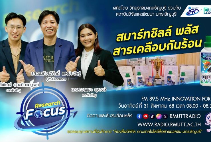 RESEARCH FOCUS [EP.38] สมาร์ทชิลล์ พลัส: สารเคลือบกันร้อน สารเคลือบผิววัสดุที่มีอนุภาคโลหะออกไซด์ขนาดระดับไมโครเมตรกระจายตัวอยู่ในตัวกลางที่เป็น แอลกอฮอล์ ผสมกับพอลิเมอร์ ซึ่งทำหน้าที่เป็นทั้งสารปรับสภาพพื้นผิวและเป็นสารช่วยยึดเกาะ สารเคลือบที่ได้มีประสิทธิภาพสูงทั้งในด้านการสะท้อนความร้อน โดยสามารถสะท้อนรังสีอินฟราเรดได้มากกว่า 90 เปอร์เซ็นต์ และควบคุมอุณหภูมิจากอนุภาคโลหะออกไซด์ได้มากกว่า 10 องศาเซลเซียส และมีความสามารถในการทำความสะอาดตัวเองโดยการป้องกันฝุ่น และกันน้ำ ลดการเกิดตะไคร่น้ำและเชื้อรา จากสมบัติไฮโดรโฟบิกของฟิล์มพอลิเมอร์ ทำให้หยดน้ำกลิ้งตัวไปไม่เกาะพื้นผิว สารเคลือบนี้สามารถเคลือบติดกับผิววัสดุหลากหลายชนิด ได้โดยตรง โดยการเกิดฟิล์มเคลือบที่คงทน และสามารถประยุกต์ใช้ในด้านต่าง ๆ เช่น อาคาร โรงเรือน เฟอร์นิเจอร์กลางแจ้ง เบาะรถจักรยานยนต์ และสิ่งทอ เป็นต้น รับฟังรายการได้ทาง FM 89.5 MHz Innovationforlife วิทยุราชมงคลธัญบุรี ...