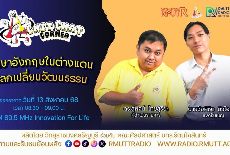Chit Chat Corner [EP.28] การใช้ภาษาอังกฤษในต่างแดน แลกเปลี่ยนวัฒนธรรม Chit Chat Corner คุยกันสนุก ทุกเรื่องภาษา ร่วมถ่ายทอดความรู้เรื่องภาษา วัฒนธรรม และการสื่อสารในรูปแบบที่เข้าใจง่าย ใช้ได้ในชีวิตประจำวัน สัปดาห์นี้ พูดคุยเกี่ยวกับเรื่อง “การใช้ภาษาอังกฤษในต่างแดน แลกเปลี่ยนวัฒนธรรม” ร่วมพูดคุยประสบการณ์กับ นักศึกษาคณะศิลปศาสตร์ มทร.รัตนโกสินทร์ บพิตรพิมุข จักรวรรดิ รับฟังรายการได้ทาง FM 89.5 MHz Innovation For Life นวัตกรรมเพื่อชีวิต วิทยุราชมงคลธัญบุรี ออกอากาศ วันที่ 13 สิงหาคม 68 เวลา 08.30 ...