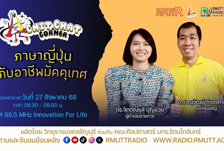 Chit Chat Corner [EP.30] ภาษาญี่ปุ่นกับอาชีพมัคคุเทศ Chit Chat Corner คุยกันสนุก ทุกเรื่องภาษา ร่วมถ่ายทอดความรู้เรื่องภาษา วัฒนธรรม และการสื่อสารในรูปแบบที่เข้าใจง่าย ใช้ได้ในชีวิตประจำวัน สัปดาห์นี้ พูดคุยเกี่ยวกับเรื่อง “ภาษาญี่ปุ่นกับอาชีพมัคคุเทศ” กับอาจารย์ผู้เชี่ยวชาญด้านภาษา คณะศิลปศาสตร์ มทร.รัตนโกสินทร์ บพิตรพิมุข จักรวรรดิ รับฟังรายการได้ทาง FM 89.5 MHz Innovation For Life นวัตกรรมเพื่อชีวิต ออกอากาศ วันที่ 27 สิงหาคม 68 เวลา 08.30 – 09.00 น. ...