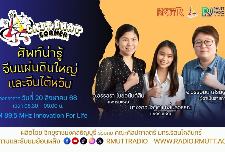 Chit Chat Corner [EP.29] ศัพท์น่ารู้ จีนแผ่นดินใหญ่และจีนไต้หวัน Chit Chat Corner คุยกันสนุก ทุกเรื่องภาษา ร่วมถ่ายทอดความรู้เรื่องภาษา วัฒนธรรม และการสื่อสารในรูปแบบที่เข้าใจง่าย ใช้ได้ในชีวิตประจำวัน สัปดาห์นี้ พูดคุยเกี่ยวกับเรื่อง “ศัพท์น่ารู้ จีนแผ่นดินใหญ่และจีนไต้หวัน” กับอาจารย์ผู้เชี่ยวชาญด้านภาษา คณะศิลปศาสตร์ มทร.รัตนโกสินทร์ บพิตรพิมุข จักรวรรดิ รับฟังรายการได้ทาง FM 89.5 MHz Innovation For Life นวัตกรรมเพื่อชีวิต ออกอากาศ วันที่ 20 สิงหาคม 68 เวลา 08.30 – ...