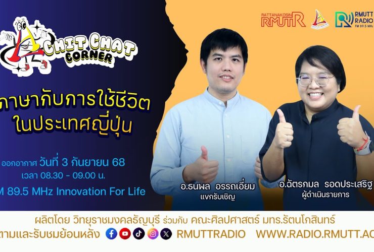 Chit Chat Corner [EP.31] ภาษากับการใช้ชีวิตในประเทศญี่ปุ่น Chit Chat Corner คุยกันสนุก ทุกเรื่องภาษา ร่วมถ่ายทอดความรู้เรื่องภาษา วัฒนธรรม และการสื่อสารในรูปแบบที่เข้าใจง่าย ใช้ได้ในชีวิตประจำวัน สัปดาห์นี้ พูดคุยเกี่ยวกับเรื่อง “ภาษากับการใช้ชีวิตในประเทศญี่ปุ่น” กับอาจารย์ผู้เชี่ยวชาญด้านภาษา คณะศิลปศาสตร์ มทร.รัตนโกสินทร์ บพิตรพิมุข จักรวรรดิ รับฟังรายการได้ทาง FM 89.5 MHz Innovation For Life นวัตกรรมเพื่อชีวิต ออกอากาศ วันที่ 3 กันยายน 68 เวลา 08.30 – 09.00 น. ...