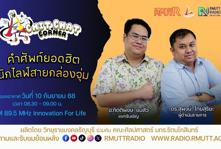 Chit Chat Corner [EP.32] คำศัพท์นักไลฟ์สายกล่องจุ่ม Chit Chat Corner คุยกันสนุก ทุกเรื่องภาษา ร่วมถ่ายทอดความรู้เรื่องภาษา วัฒนธรรม และการสื่อสารในรูปแบบที่เข้าใจง่าย ใช้ได้ในชีวิตประจำวัน สัปดาห์นี้ พูดคุยเกี่ยวกับเรื่อง “คำศัพท์นักไลฟ์สายกล่องจุ่ม” กับอาจารย์ผู้เชี่ยวชาญด้านภาษา คณะศิลปศาสตร์ มทร.รัตนโกสินทร์ บพิตรพิมุข จักรวรรดิ รับฟังรายการได้ทาง FM 89.5 MHz Innovation For Life นวัตกรรมเพื่อชีวิต ออกอากาศ วันที่ 10 กันยายน 68 เวลา 08.30 – 09.00 น. ...