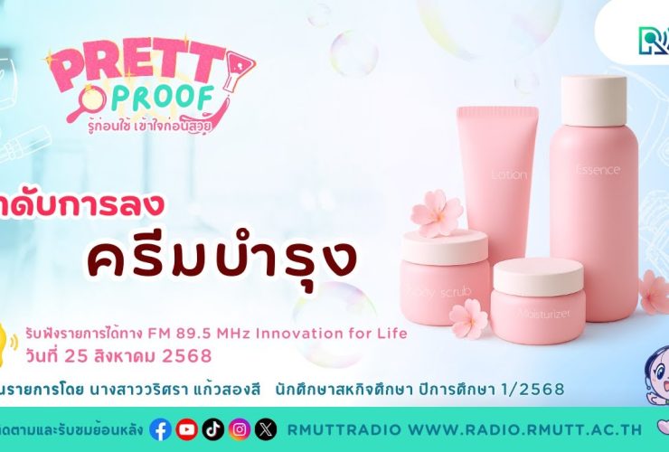 Pretty Proof รู้ก่อนใช้… เข้าใจก่อนสวย นำเสนอสาระความรู้ด้านวิทยาศาสตร์เพื่อการตัดสินใจด้านความงามอย่างมืออาชีพ เพื่อให้คุณมีข้อมูลในการตัดสินใจดูแลตัวเองอย่างชาญฉลาด ดำเนินรายการโดย วริศรา แก้วสองสี นักศึกษาสหกิจศึกษา ปีการศึกษา 1/2568 สาขานวัตกรรมการสื่อสาร คณะบริหารธุรกิจและเทคโนโลยีสารสนเทศ มหาวิทยาลัยเทคโนโลยีราชมงคลตะวันออก เขตพื้นที่จักรพงษภูวนารถ รับฟังรายการได้ทาง FM 89.5 MHz Innovation For Life นวัตกรรมเพื่อชีวิต วิทยุราชมงคลธัญบุรี ออกอากาศ วันที่ 6 ตุลาคม 68 เวลา 11.30 – 12.00 น. ...