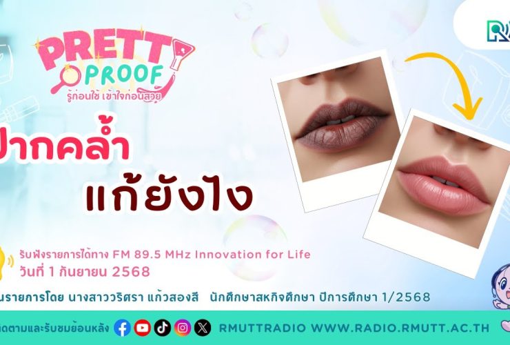 Pretty Proof รู้ก่อนใช้… เข้าใจก่อนสวย นำเสนอสาระความรู้ด้านวิทยาศาสตร์เพื่อการตัดสินใจด้านความงามอย่างมืออาชีพ เพื่อให้คุณมีข้อมูลในการตัดสินใจดูแลตัวเองอย่างชาญฉลาด ดำเนินรายการโดย วริศรา แก้วสองสี นักศึกษาสหกิจศึกษา ปีการศึกษา 1/2568 สาขานวัตกรรมการสื่อสาร คณะบริหารธุรกิจและเทคโนโลยีสารสนเทศ มหาวิทยาลัยเทคโนโลยีราชมงคลตะวันออก เขตพื้นที่จักรพงษภูวนารถ รับฟังรายการได้ทาง FM 89.5 MHz Innovation For Life นวัตกรรมเพื่อชีวิต วิทยุราชมงคลธัญบุรี ออกอากาศ วันที่ 25 สิงหาคม 68 เวลา 11.30 – 12.00 น. ...
