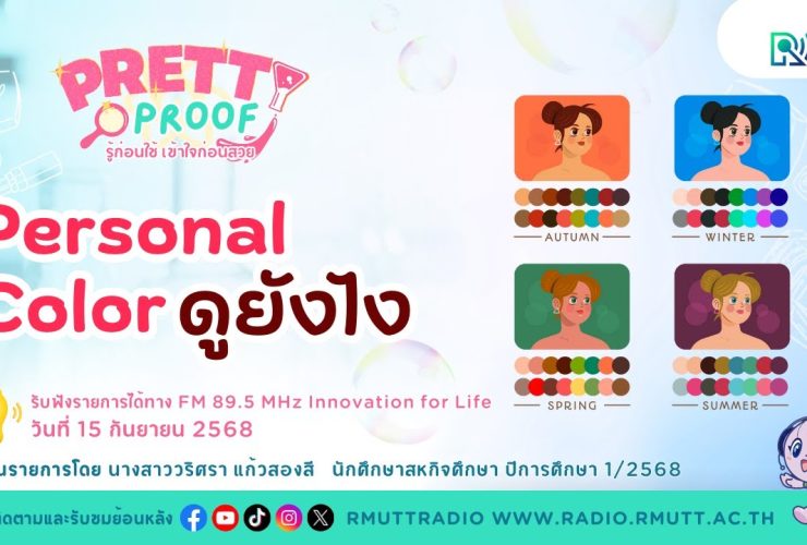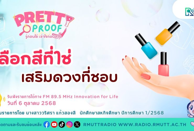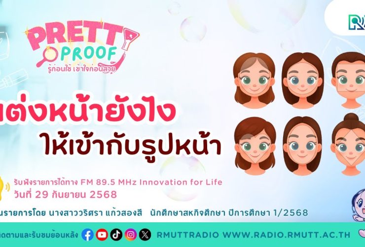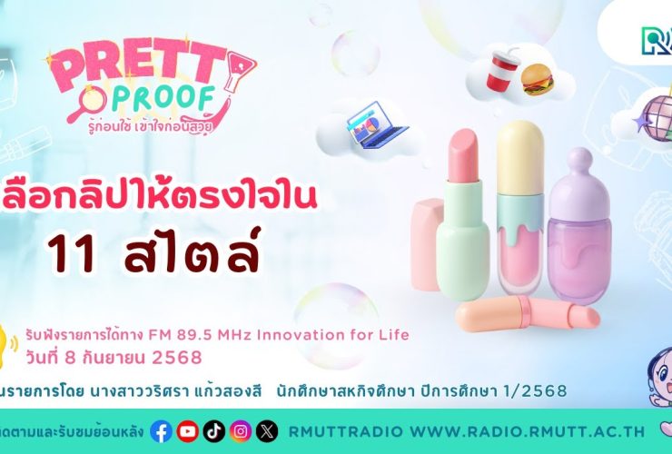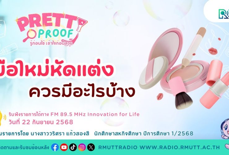 Pretty Proof รู้ก่อนใช้… เข้าใจก่อนสวย นำเสนอสาระความรู้ด้านวิทยาศาสตร์เพื่อการตัดสินใจด้านความงามอย่างมืออาชีพ เพื่อให้คุณมีข้อมูลในการตัดสินใจดูแลตัวเองอย่างชาญฉลาด ดำเนินรายการโดย วริศรา แก้วสองสี นักศึกษาสหกิจศึกษา ปีการศึกษา 1/2568 สาขานวัตกรรมการสื่อสาร คณะบริหารธุรกิจและเทคโนโลยีสารสนเทศ มหาวิทยาลัยเทคโนโลยีราชมงคลตะวันออก เขตพื้นที่จักรพงษภูวนารถ รับฟังรายการได้ทาง FM 89.5 MHz Innovation For Life นวัตกรรมเพื่อชีวิต วิทยุราชมงคลธัญบุรี ออกอากาศ วันที่ 22 กันยายน 68 เวลา 11.30 – 12.00 น. ...