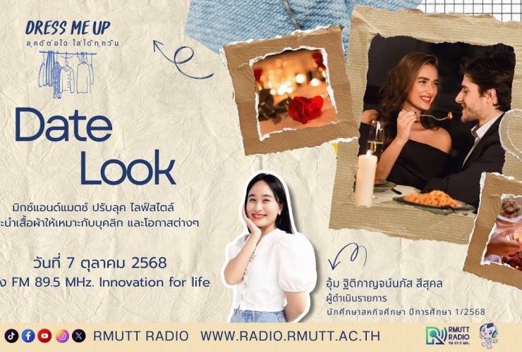 Dress Me Up (ลุคดีต่อใจ ใส่ได้ทุกวัน) เราจะพาคุณไปเรียนรู้การมิกซ์แอนด์แมตช์เสื้อผ้า ปรับลุค ไลฟ์สไตล์ แนะนำเสื้อผ้าให้เหมาะกับบุคลิก และโอกาสต่างๆ ดำเนินรายการโดย อุ้ม ฐิติกาญจน์นภัส สีสุคล นักศึกษาสหกิจศึกษา ปีการศึกษา 1/2568 สาขาเทคโนโลยีการโทรทัศน์และวิทยุกระจายเสียง คณะเทคโนโลยีสื่อสารมวลชน มหาวิทยาลัยเทคโนโลยีราชมงคลธัญบุรี รับฟังรายการได้ทาง FM 89.5 MHz Innovation For Life นวัตกรรมเพื่อชีวิต วิทยุราชมงคลธัญบุรี ออกอากาศ วันที่ 16 กันยายน 68 เวลา 11.30 – 12.00 น. ...