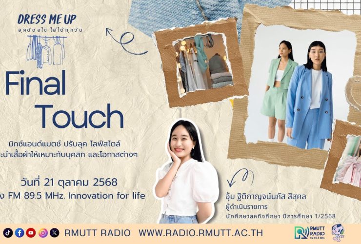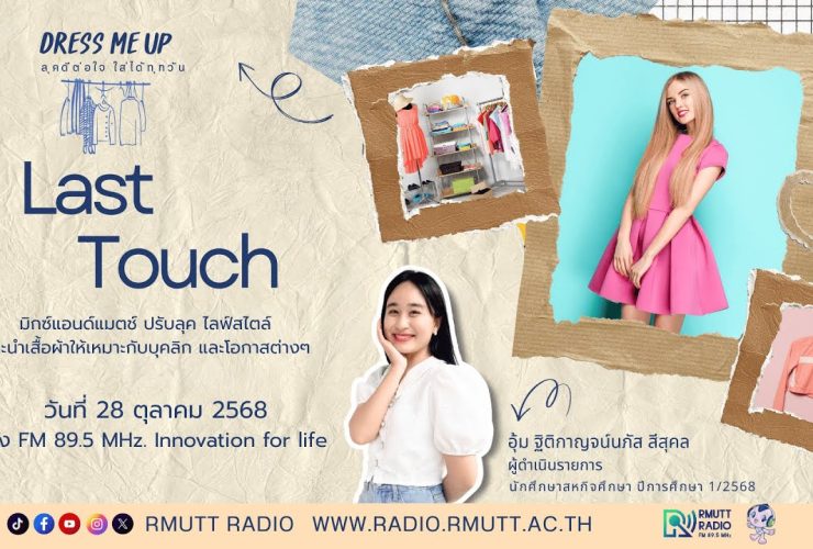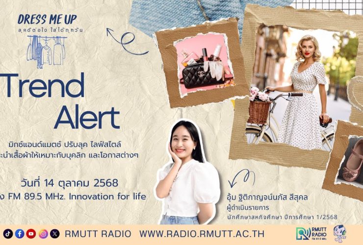 Dress Me Up (ลุคดีต่อใจ ใส่ได้ทุกวัน) เราจะพาคุณไปเรียนรู้การมิกซ์แอนด์แมตช์เสื้อผ้า ปรับลุค ไลฟ์สไตล์ แนะนำเสื้อผ้าให้เหมาะกับบุคลิก และโอกาสต่างๆ ดำเนินรายการโดย อุ้ม ฐิติกาญจน์นภัส สีสุคล นักศึกษาสหกิจศึกษา ปีการศึกษา 1/2568 สาขาเทคโนโลยีการโทรทัศน์และวิทยุกระจายเสียง คณะเทคโนโลยีสื่อสารมวลชน มหาวิทยาลัยเทคโนโลยีราชมงคลธัญบุรี รับฟังรายการได้ทาง FM 89.5 MHz Innovation For Life นวัตกรรมเพื่อชีวิต วิทยุราชมงคลธัญบุรี ออกอากาศ วันที่ 30 กันยายน 68 เวลา 11.30 – 12.00 น. ...
