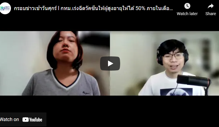 กรอบข่าวเช้าวันศุกร์ l- กทม.เปิดระบบจองฉีดวัคซีนโควิด-19 ผ่านเว็บ www.ไทยร่วมใจ.com แอปฯ “เป๋าตัง” และร้านสะดวกซื้อ เริ่มฉีด 7 มิ.ย.64 – สธ.เผยผลศึกษาในภูเก็ต ผู้รับวัคซีนซิโนแวกครบ 2 เข็มลดโอกาสติดโควิดได้ 83% – สภากาชาดไทย รับสมัครแพทย์ พยาบาลจิตอาสาและอาสาสมัครทั่วไปให้บริการฉีดวัคซีนโควิด-19 แก่ประชาชนในพื้นที่ กทม.และส่วนภูมิภาค . ดำเนินรายการโดย ปิยะพงษ์ เคนทวาย และ อาทิตยา ปักกะทานัง . ออกอากาศ[28 พฤษภาคม 2562 ] ติดตามรับฟังได้ทาง#กรอบข่าวเช้าวันศุกร์ #วิทยุราชมงคลธัญบุรี #ศบค #โควิด #ไทยร่วมใจ ...