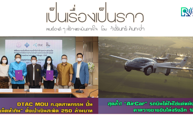 เป็นเรื่องเป็นราว l – DTAC MOU ก.อุตสาหกรรม ปั้น “เน็ตทำกิน” ตั้งเป้าเงินสะพัด 250 ล้านบาท – หอการค้าภาคเหนือ เสริมแกร่ง SMEs จับมือ 14 มหาวิทยาลัย ติดปีกนวัตกรรม – สุดล้ำ! “AirCar” รถบินได้ไม่ใช่แค่หนัง คาดวางขายขับได้จริงอีก 12 เดือน – SONY เตรียมโดดเข้าวงการผลิต “รถยนต์ไฟฟ้า” . ดำเนินรายการโดย วัชรินทร์ คันทะชา @เล่าเป็นเรื่อง . ออกอากาศ [16 มีนาคม 2565 ...