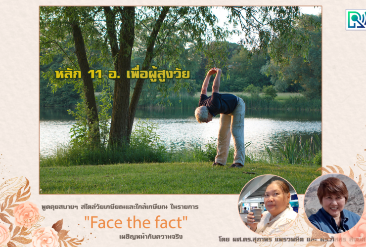 FaceTheFact l หลัก 11 อ. เพื่อผู้สูงวัย . ข้อมูลจาก สสส. (สำนักงานกองทุนสนับสนุนการสร้างเสริมสุขภาพ) ได้ให้ข้อมูลในการดูแลตัวเองและกิจกรรมต่างๆตามสภาพร่างกาย จิตใจ สำหรับผู้สูงวัย โดยยึดหลัก 11 อ. ที่เหมาะสมสำหรับแต่ละคน ดังนี้ 1. อาหาร, 2. อากาศ, 3. ออกกำลังกาย, 4. (แสง)อาทิตย์, 5. อารมณ์, 6. อบอุ่น, 7. อนามัย, 8. อดิเรก, 9. อุจาระ, 10. อุบัติเหตุ, 11. อนาคต ...