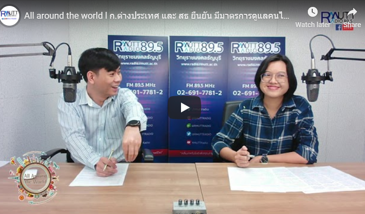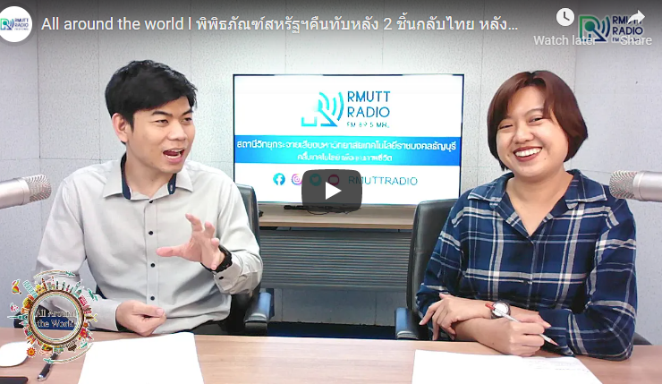 All around the world (ช่วงที่ 1) Topic ในช่วงที่ 1 – สตีเฟน คิง บริจาคเงินให้นักเรียนประถม เขียนนิยายว่าด้วยโรคโควิด 19 – พิพิธภัณฑ์สหรัฐฯ คืนทับหลัง 2 ชิ้นกลับไทย หลังถูกโจรกรรมไปร่วม 60 ปี – แม่ลูกออสเตรเลีย เกิดภาพหลอนหลังกินบราวนี่ คาดผสมกัญชา ตัดสินใจฟ้องเจ้าของร้านกาแฟ [21 กุมภาพันธ์ 2564] ดำเนินรายการโดย อาทิตยา ปักกะทานัง และปิยะพงษ์ เคนทวาย ออกอากาศทางสถานีวิทยุกระจายเสียงมหาวิทยาลัยเทคโนโลยีราชมงคลธัญบุรี FM 89.5 HHz ...