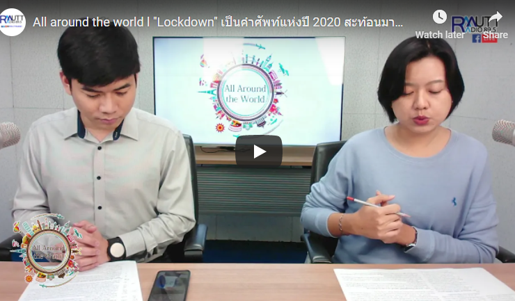 All around the world (ช่วงที่ 2) Topic ในช่วงที่ 2 – พจนานุกรมภาษาอังกฤษคอลลินส์ ยกคำว่า Lockdown เป็นคำศัพท์แห่งปี 2020 สะท้อนมาตรการควบคุม COVID-19 ระบาดทั่วโลก – นักจิตวิทยาชื่อดัง ระบุปัจจุบันตัวเลขนักเตะติดเกมจนต้องเข้ารับการบำบัดสูงกว่าช่วง Lockdoen จาก COVID-19 ครั้งแรกถึง 3 เท่า แม้ฤดูกาลกลับมาเตะแล้วก็ยังไม่หมดปัญหา – ยอมใจ! เด็กชายชาวจีนติดอยู่ในลิฟท์ แต่ไม่กลัว…คว้าการบ้านมาทำระหว่างรอเจ้าหน้าที่มาช่วยเหลือ [15 พฤศจิกายน 2563] ดำเนินรายการโดย อาทิตยา ปักกะทานัง และปิยะพงษ์ เคนทวาย ...