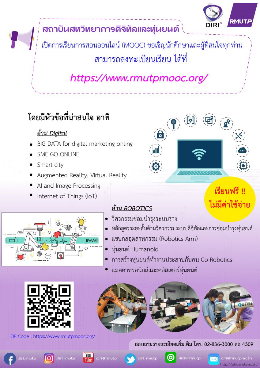 มหาวิทยาลัยเทคโนโลยีราชมงคลพระนคร เชิญชวนผู้สนใจพัฒนาทักษะด้านดิจิทัล ผ่านช่องทางออนไลน์ฟรี Posted by radio895 Last Updated: July 21, 2021 ดร.ปริญญ์ บุญกนิษฐ รองอธิการบดีฝ่ายวิจัยและพัฒนานวัตกรรม และผู้อำนวยการสถาบันสหวิทยาการดิจิทัลและหุ่นยนต์ มหาวิทยาลัยเทคโนโลยีราชมงคลพระนคร เปิดเผยว่า เพื่อมุ่งพัฒนาทักษะการทำงานด้านดิจิทัลและหุ่นยนต์ของนักศึกษาและบุคลากรภาคอุตสาหกรรรม และตอบสนองการพัฒนานโยบายประเทศไทย 4.0 ตลอดจนส่งเสริมกำลังคนที่มีสมรรถนะให้ตอบโจทย์ภาคการผลิต ดังนั้นสถาบันสหวิทยาการดิจิทัลและหุ่นยนต์ จึงมุ่งพัฒนาหลักสูตรการเรียนการสอน ด้าน Digital, Robotics, เทคโนโลยีอุตสาหกรรม 4.0 โดยจับมือกับภาคธุรกิจเอกชนและหน่วยงานรัฐมากมายที่เข้ามาคอยให้ความรู้อย่างต่อเนื่อง ซึ่งผู้เรียนทั้งนักศึกษา หรือผู้ที่ทำงานในภาคอุตสาหกรรมสามารถเข้ามาศึกษาพิ่มเติม และนำความรู้ไปพัฒนาและประยุกต์กับการทำงานและการเรียนของตนได้อย่างต่อเนื่อง โดยมีหัวข้อที่น่าสนใจมากมาย อาทิ อุตสาหกรรม 4.0 , วิศวกรรมซ่อมบำรุงระบบราง , แขนกลอุตสาหกรรม , หลักสูตรการพัฒนาความรู้ระบบ AI และ Image Processing เพื่อแก้ปัญหาการผลิตสำหรับอุตสาหกรรม SME และหลักสูตรหุ่นยนต์ทำงานประสานกับคน ผู้สนใจสามารถลงทะเบียนเรียนฟรีได้ที่ https://www.rmutpmooc.org หรือสอบถามเพิ่มเติมสถาบันสหวิทยาการดิจิทัลและหุ่นยนต์ โทร. 0 -2836 -3000 ต่อ 4309 . ณัฐภัทรพล จุติการพาณิชย์ สื่อสารองค์การราชมงคลพระนคร รายงาน popular posts ราชมงคลธัญบุรี ชวนร่วมชมและเชียร์ทัพนักกีฬาในการแข่งขันกีฬามหาวิทยาลัยแห่งประเทศไทย ครั้งที่ 51 รอบคัดเลือก เขตภาคกลาง “ธัญบุรีเกมส์” 16 – 20 พ.ย.นี้ มทร.ธัญบุรี เตรียมจัดพิธีพระราชทานปริญญาบัตร ครั้งที่ 39 ประจำปีการศึกษา 2567 วันที่ 12 พ.ย.นี้ สถานีวิทยุราชมงคลธัญบุรี เปิดรับสมัคร เจ้าหน้าที่ประชาสัมพันธ์ Wellness talk (EP.90) I ความกดดันสู่พลังใจ : สร้าง Resilience ป้องกันสุขภาพจิตในรั้วมหาวิทยาลัย radio895 July 21, 2021