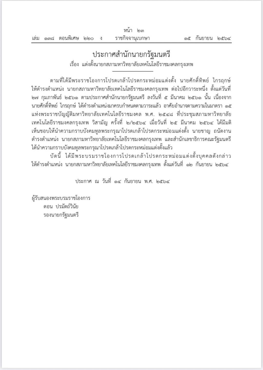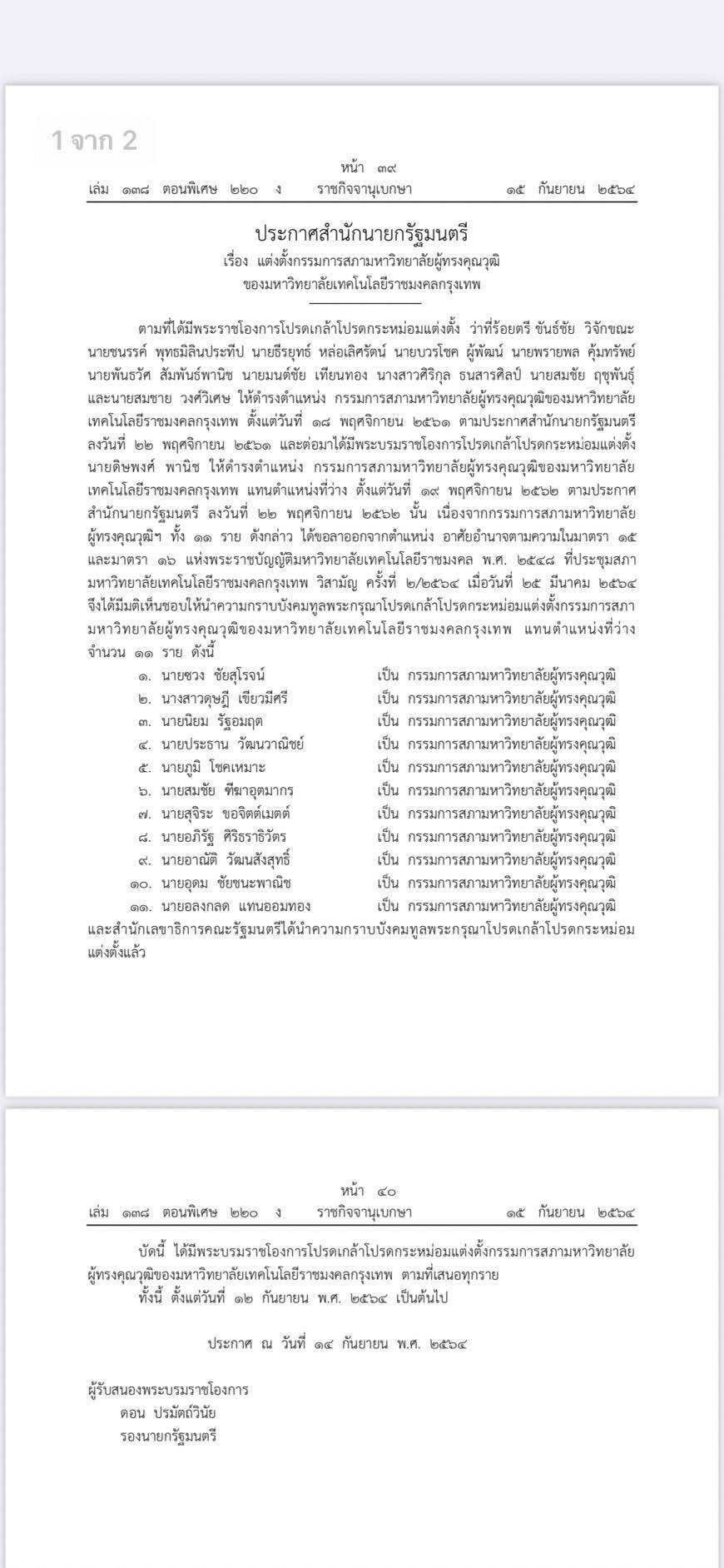 พระบาทสมเด็จพระเจ้าอยู่หัว ทรงพระกรุณาโปรดเกล้าฯ แต่งตั้งนายกสภามหาวิทยาลัยเทคโนโลยีราชมงคลกรุงเทพ และกรรมการสภามหาวิทยาลัยผู้ทรงคุณวุฒิ 11 ราย Posted by radio895 Last Updated: September 23, 2021 พระบาทสมเด็จพระเจ้าอยู่หัว ทรงพระกรุณาโปรดเกล้าโปรดกระหม่อมแต่งตั้ง นายชาญ ถนัดงาน เป็นนายกสภามหาวิทยาลัยเทคโนโลยีราชมงคลกรุงเทพ และกรรมการสภามหาวิทยาลัยผู้ทรงคุณวุฒิ 11 ราย ตั้งแต่วันที่ 12 กันยายน 2564 เป็นต้นไป โดยประกาศในราชกิจจานุเบกษาเล่ม 138 ตอนพิเศษ 220 ง ลงวันที่ 14 กันยายน 2564 มีรายชื่อ ดังนี้ 1. นายชาญ ถนัดงาน เป็นนายกสภามหาวิทยาลัย 2. นายซวง ชัยสุโรจน์ 3. นางสาวดุษฎี เขียวมีศรี 4. นายนิยม รัฐอมฤต 5. นายประธาน วัฒนวาณิชย์ 6. นายภูมิ โชคเหมาะ 7. นายสมชัย ฑีฆาอุตมากร 8. นายสุจิระ ขอจิตต์เมตต์ 9. นายอภิรัฐ ศิริธราธิวัตร 10. นายอาณัติ วัฒนสังสุทธิ์ 11. นายอุดม ชัยชนะพาณิช และ12. นายอลงกลด แทนออมทอง เป็นกรรมการสภามหาวิทยาลัยผู้ทรงคุณวุฒิ . ฐิติรัตน์ แสงบุญเกิด มหาวิทยาลัยเทคโนโลยีราชมงคลกรุงเทพ รายงาน popular posts ราชมงคลธัญบุรี ชวนร่วมชมและเชียร์ทัพนักกีฬาในการแข่งขันกีฬามหาวิทยาลัยแห่งประเทศไทย ครั้งที่ 51 รอบคัดเลือก เขตภาคกลาง “ธัญบุรีเกมส์” 16 – 20 พ.ย.นี้ FIN TALK [EP.113] ชีวิตติดแอปฯ กับ Embedded Finance : ใช้จ่ายง่าย แต่หนี้ร้ายกว่าเดิม สถานีวิทยุราชมงคลธัญบุรี เปิดรับสมัคร เจ้าหน้าที่ประชาสัมพันธ์ เพลินภาษานานาสาระ l ธรรมเนียมการฝังรก radio895 September 23, 2021