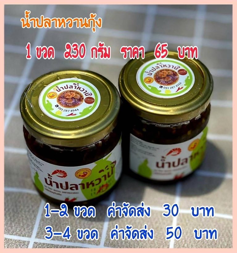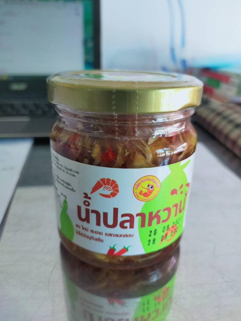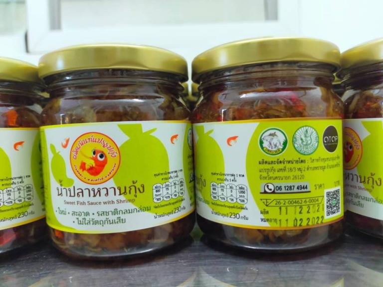 ผลิตภัณฑ์น้ำปลาหวานเป็นแนวคิดร่วมกันระหว่างวิสาหกิจชุมชนและนักวิจัย น้ำปลาหวานสูตรนี้จะใช้กุ้งขาวในการผลิต ซึ่งกุ้งขาวจะมีรสชาติจืด ไม่มีรสเค็ม สามารถควบคุมคุณภาพด้านรสชาติและโซเดียมในผลิตภัณฑ์ได้ง่าย รสชาติอร่อย กลมกล่อม ไม่จัดจนเกินไป สีสวยน่ารับประทาน กลิ่นไม่แรง สามารถรับประทานในออฟฟิศที่มีเครื่องปรับอากาศได้โดยไม่มีกลิ่นเหม็นฟุ้ง สะอาด ได้คุณภาพ รับประทานกับผลไม้ได้หลายชนิด น้ำปลาหวาน 1 กระปุกมีปริมาณ 230 กรัม ราคากระปุกละ 69 บาท บรรจุด้วยขวดแก้ว มีฝาปิดสนิท ง่ายและสะดวกต่อการขนส่ง มีเครื่องหมาย อย.และฉลากโภชนาการ