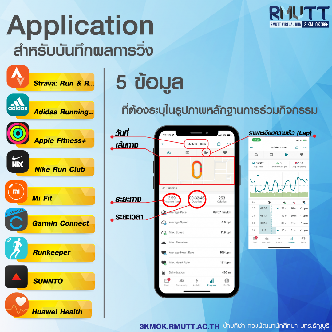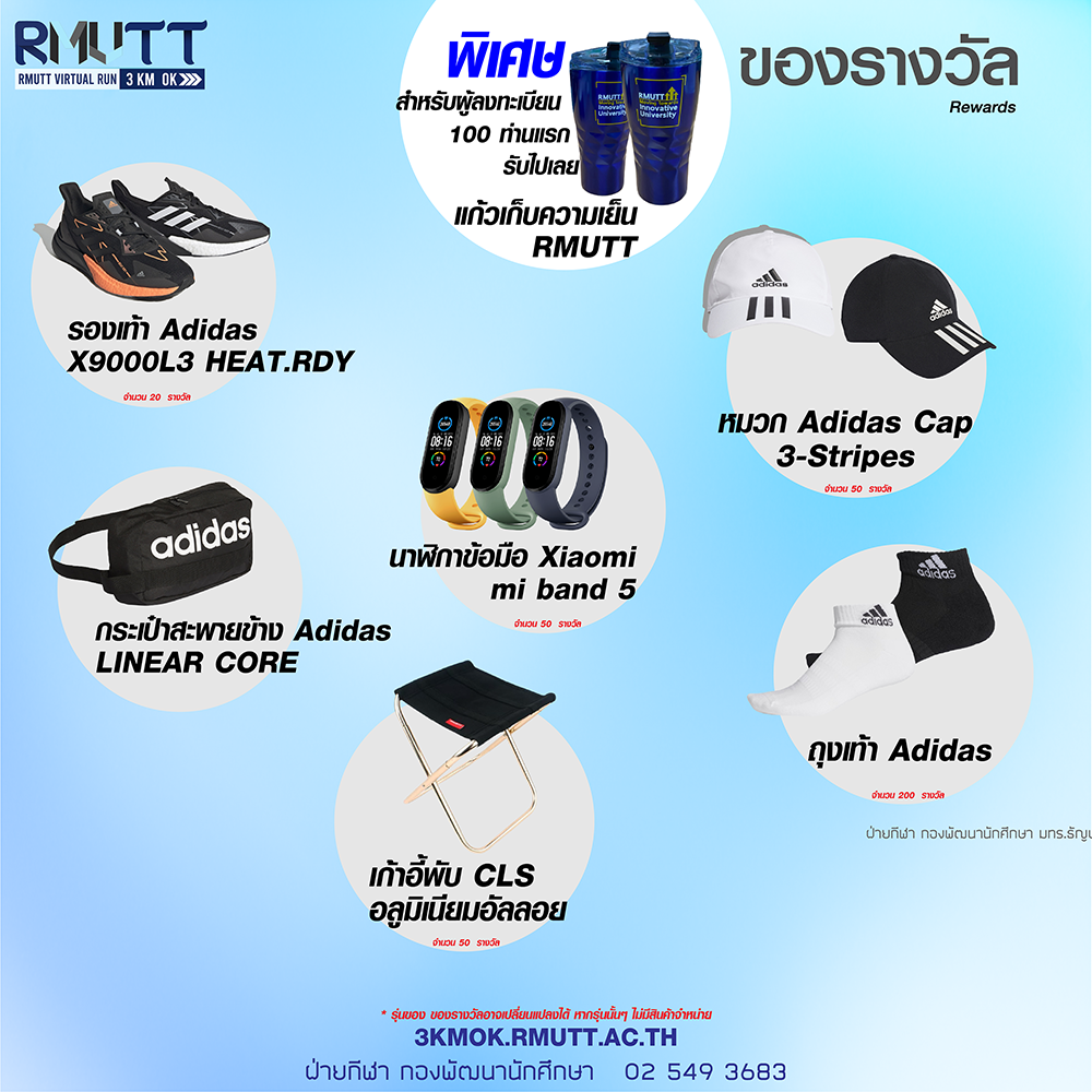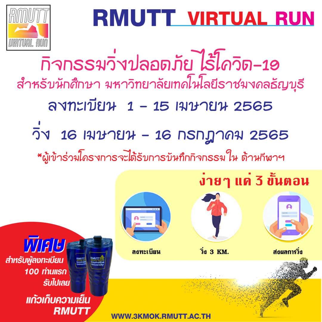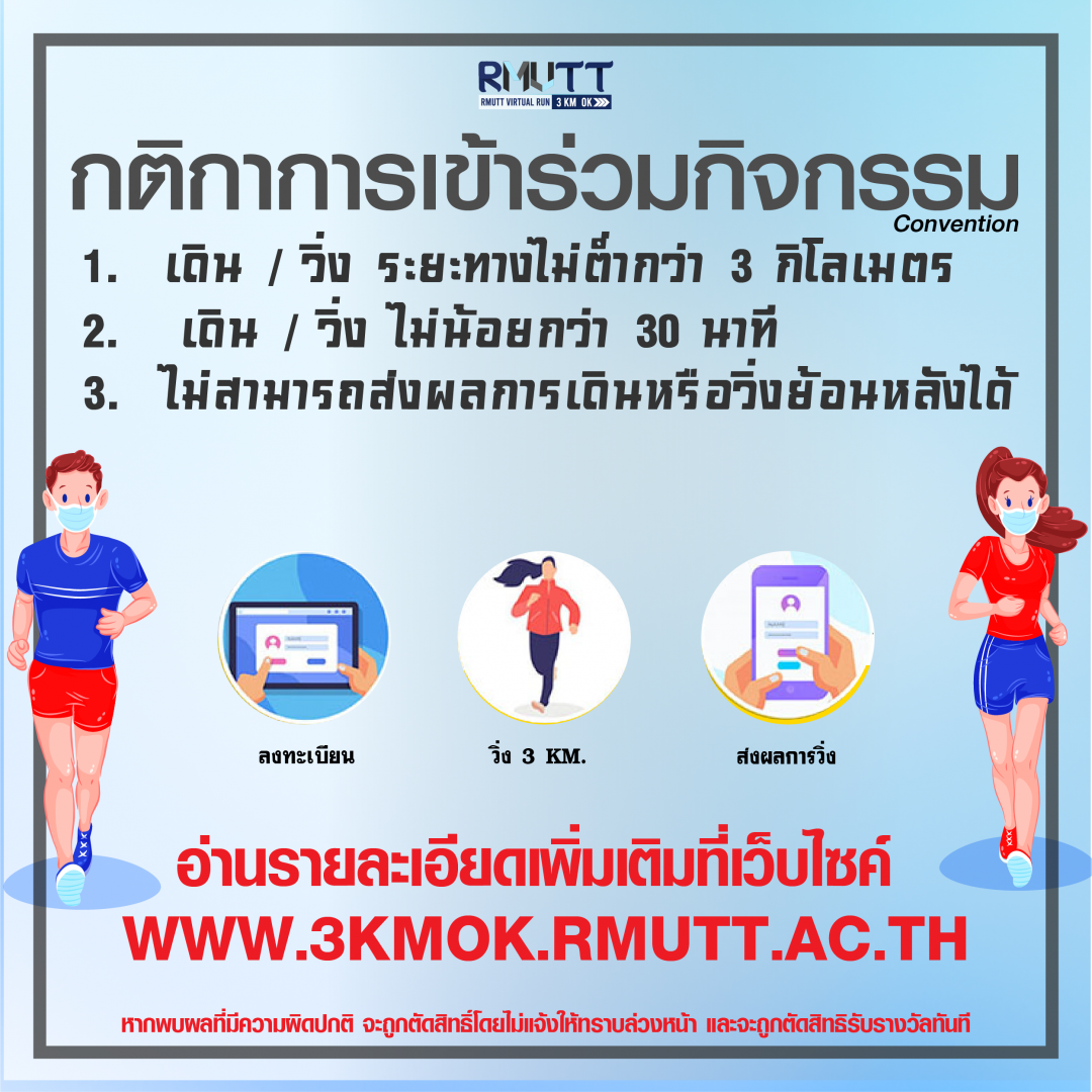 โดยลงทะเบียนผ่านระบบออนไลน์ https://www.3kmok.rmutt.ac.th ภายในวันที่ 15 เมษายน 2565 เริ่มส่งผลการวิ่งได้ตั้งแต่วันที่ 16 เมษายน – 16 กรกฎาคม 2565 ผู้ทำกิจกรรมครบถ้วนถูกต้องตามกติกาและเงื่อนไขจะได้รับรางวัล สอบถามรายละเอียดเพิ่มเติมได้ที่ ฝ่ายกีฬา กองพัฒนานักศึกษา 0-2549-3683, 0-2549 3629 Facebook : ฝ่ายกีฬา กองพัฒนานักศึกษา มทร.ธัญบุรี