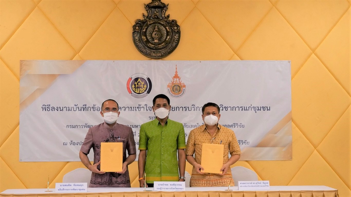 สำหรับการลงนามในครั้งนี้ของทั้งสองหน่วยงาน เกิดความตระหนักในการรับผิดต่อสังคมและความสำคัญในการให้บริการทางวิชาการแก่ชุมชน และมีเจตนารมณ์ร่วมกันในการพัฒนาศักยภาพด้านการเรียนรู้ การพัฒนาองค์ความรู้ ด้านการพัฒนาชุมชน การยกระดับเศรษฐกิจของชุมชน ส่งเสริมการบริการวิชาการแก่ชุมชนและท้องถิ่นด้วยฐานวิทยาศาสตร์เทคโนโลยีและทุนทางวัฒนธรรม รวมทั้งเพื่อให้เกิดการบูรณาการทรัพยากร การจัดการหน่วยงานเครือข่าย การบริการทางวิชาการของมหาวิทยาลัยเทคโนโลยีราชมงคลศรีวิชัยและกรมการพัฒนาชุมชน กระทรวงมหาดไทย ในการพัฒนาทรัพยากรมนุษย์ในระดับต่างๆ ให้เชี่ยวชาญทันเหตุการณ์สอดรับกับสถานการณ์ปัจจุบัน เกิดองค์ความรู้ใหม่ อันเป็นกำลังสำคัญในการพัฒนาระดับชุมชนและระดับภูมิภาคด้วยหลักวิชาการ ทั้งสองฝ่ายจึงเห็นสมควรทำบันทึกข้อตกลงความเข้าใจว่าด้วยการบริการทางวิชาการแก่ชุมชนในพื้นที่ให้บริการทางวิชาการของมหาวิทยาลัยเทคโนโลยีราชมงคลศรีวิชัย ได้แก่ จังหวัดสงขลา จังหวัดนครศรีธรรมราช จังหวัดตรัง จังหวัดสตูล และจังหวัดกระบี่