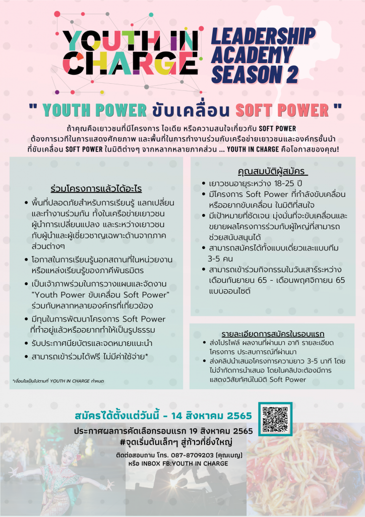 คุณสมบัติผู้สมัคร เป็นเยาวชนอายุระหว่าง 18-25 ปี มีโครงการ Soft Power ที่กำลังขับเคลื่อนหรืออยากขับเคลื่อนในมิติที่สนใจ มีเป้าหมายที่ชัดเจน สามารถสมัครได้ทั้งแบบเดี่ยวและแบบทีม 3-5 คน สามารถเข้าร่วมกิจกรรมได้ในวันเสาร์ระหว่างเดือนกันยายน – พฤศจิกายน 2565 แบบออนไซต์ สมัครได้ตั้งแต่วันนี้ – 14 สิงหาคม 2565 ประกาศผลการคัดเลือกรอบแรกวันที่ 19 สิงหาคม 2565 สอบถามรายละเอียดได้ที่ 08 – 7870 – 9203 หรือแฟนเพจเฟซบุ๊ก YOUTH IN CHARGE