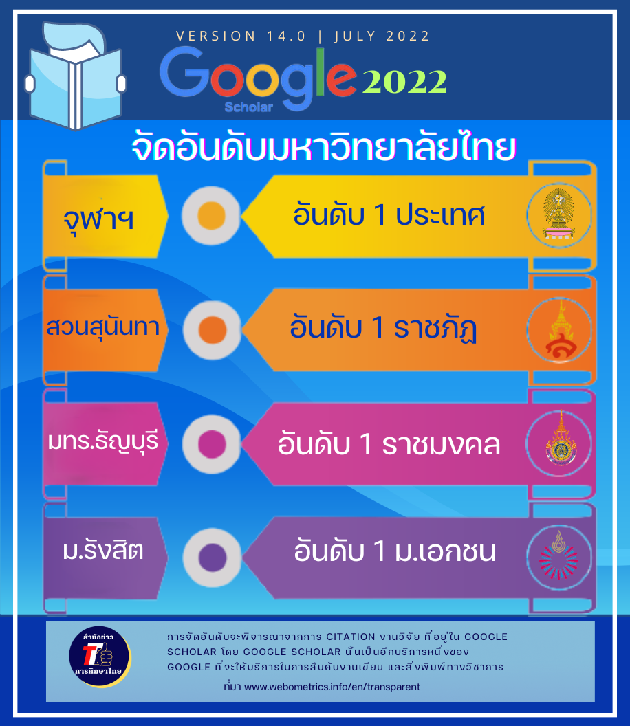 โดยผลการจัดอันดับพบว่า มหาวิทยาลัยเทคโนโลยีราชมงคลธัญบุรี เป็นอันดับ 1 ในกลุ่มมหาวิทยาลัยเทคโนโลยีราชมงคลและอยู่ในอันดับที่ 17 ของประเทศ จำนวน CITATIONS 26871 ทั้งนี้ อันดับที่ 1 เป็นของจุฬาลงกรณ์มหาวิทยาลัย จำนวน CITATIONS 461717 มหาวิทยาลัยราชภัฎสวนสุนันทา ครองอันดับ 1 ในกลุ่มมหาวิทยาลัยราชภัฏ อันดับที่ 24 ของประเทศ จำนวน CITATIONS 13448 และมหาวิทยาลัยรังสิต ครองอันดับ 1 ในกลุ่มมหาวิทยาลัยเอกชน อันดับ 18 ของประเทศ จำนวน CITATIONS 26308 ผู้ที่สนใจสามารถตรวจสอบการจัดอันดับได้ที่ www.webometrics.info/en/transparent
