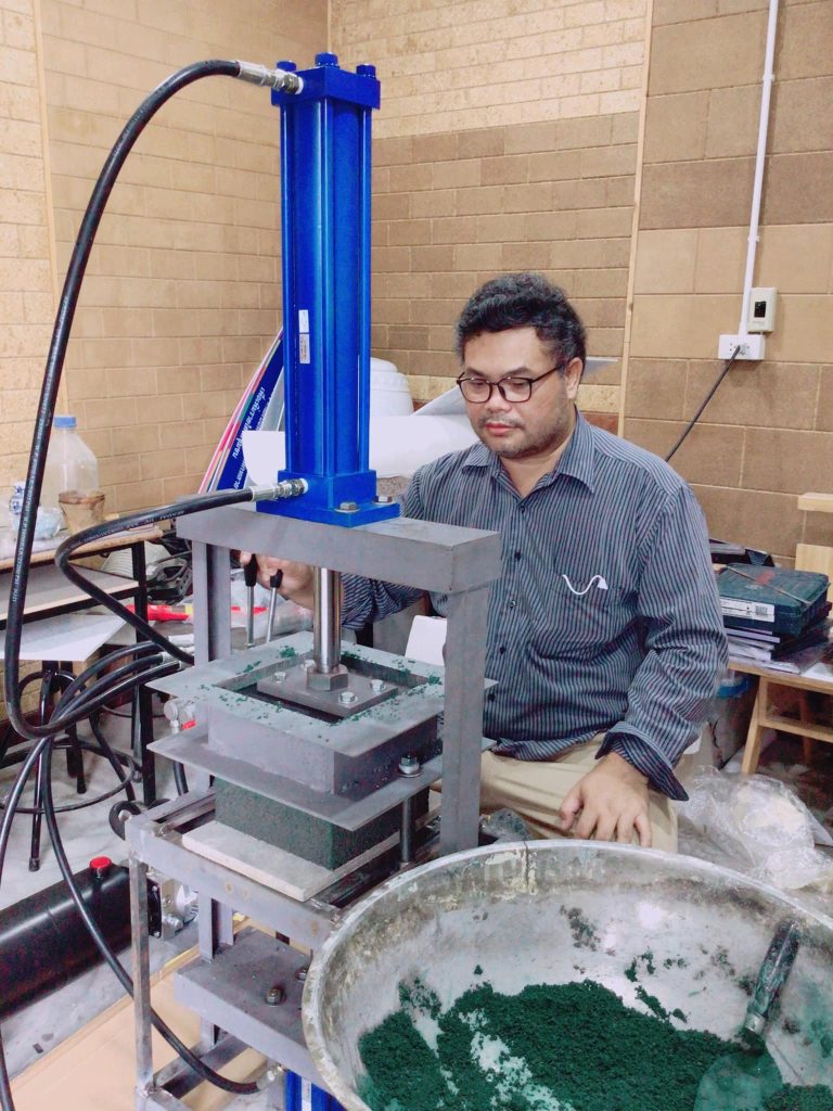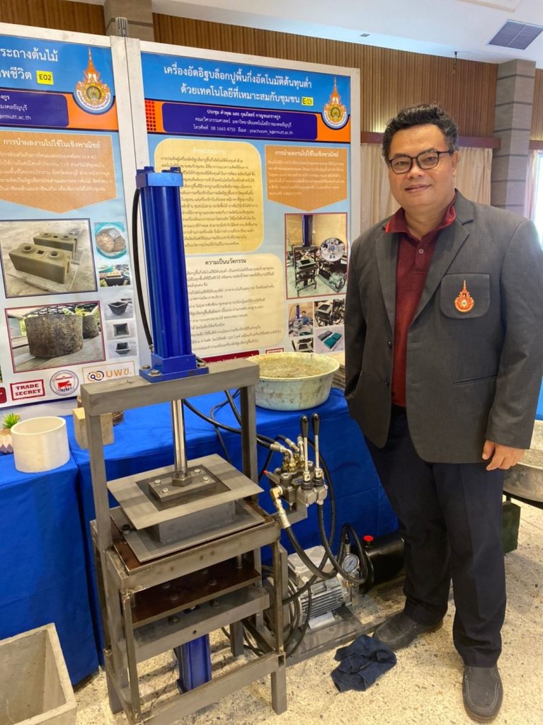 โดย ผศ.ดร.ประชุม เผยว่า ต้องการพัฒนาคุณภาพชีวิตให้กับชุมชนที่มีต้นทุนต่ำในการพัฒนาผลิตภัณฑ์ ซึ่งปัญหาใหญ่ของชุมชนคือต้องการเข้าถึงเทคโนโลยีเครื่องจักรสำหรับใช้ในการผลิตอิฐบล็อกปูพื้นที่มีราคาถูกแต่มีประสิทธิภาพสูง ทีมวิจัยจึงได้คิดค้นเครื่องจักรที่มีราคาถูกและเหมาะสมกับการผลิตในระดับชุมชน ลักษณะเครื่องอัดอิฐบล็อกปูพื้นกึ่งอัตโนมัติต้นทุนต่ำ เป็นเครื่องอัดแบบกระบอกไฮดรอลิค ใช้มือบังคับคันโยกในการอัดขึ้นรูปตามแบบที่กำหนด สามารถนั่งทำกับโต๊ะทำงาน ดึงขึ้นงานออกทางแนวราบด้านล่างเครื่องอัด การทำงานที่ง่าย มีขนาดเล็กน้ำหนักเบา ได้ผลิตภัณฑ์ที่มีคุณภาพเทียบเท่ากับที่จำหน่ายในท้องตลาด เป็นนวัตกรรมใหม่ที่ยังไม่มีในประเทศไทย เหมาะสมกับทุกชุมชนสามารถใช้งานได้ในทุกพื้นที่ที่มีไฟฟ้าใช้ หรือสามารถติดตั้งโซล่าเซลล์ได้ในกรณีที่ไม่มีไฟฟ้าเข้าถึง ผู้ที่สนใจสอบถามรายละเอียดเพิ่มเติมได้ที่ 08 – 166 – 54755