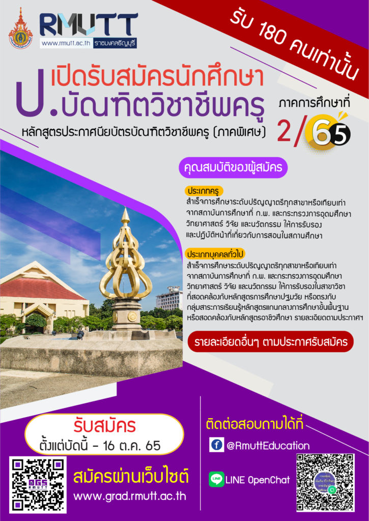 รับสมัครตั้งแต่บัดนี้ถึงวันที่ 16 ตุลาคม 2565 เข้าดูรายละเอียดเพิ่มเติมได้ที่ www.grad.rmutt.ac.th หรือที่สำนักงานภาควิชาการศึกษา 0 2549 3207