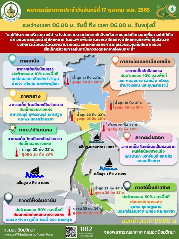 08.00 กรมอุตุนิยมฯ เผย ไทยตอนบนอากาศเย็น ส่วนภาคใต้ฝนหนัก ทะเลคลื่นสูงกว่า 2 เมตร