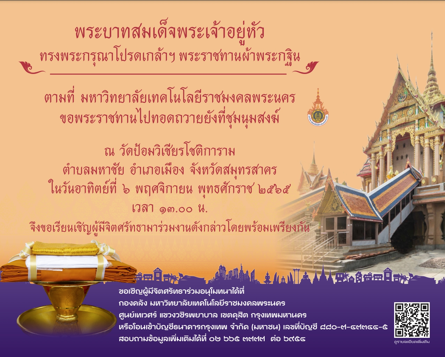 หรือโอนเงินเข้าบัญชีธนาคารกรุงเทพ จำกัด (มหาชน) ชื่อบัญชี กฐินพระราชทาน มทร.พระนคร ประจำปี 2565 เลขที่บัญชี 880-7-47344-5 และส่งหลักฐานการโอนเงินให้กองกลาง มหาวิทยาลัยเทคโนโลยีราชมงคลพระนคร ผ่านอีเมล gad-coop@rmutp.ac.th เพื่อมหาวิทยาลัยจะได้ออกใบอนุโมทนาบัตรต่อไป สอบถามข้อมูลเพิ่มเติมโทร 02 665 3721
