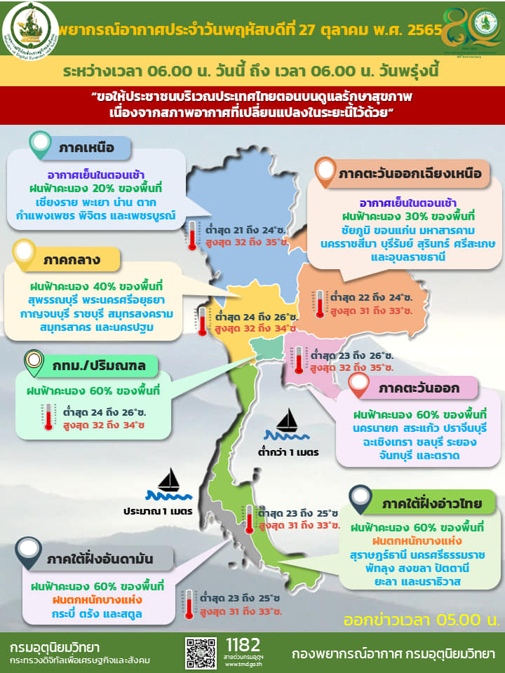 08.00 กรมอุตุฯ เผย ประเทศไทยตอนบนอากาศเย็นตอนเช้า และมีฝนตกบางแห่ง กรุงเทพและปริมณฑล มีฝนร้อยละ 60 ของพื้นที่