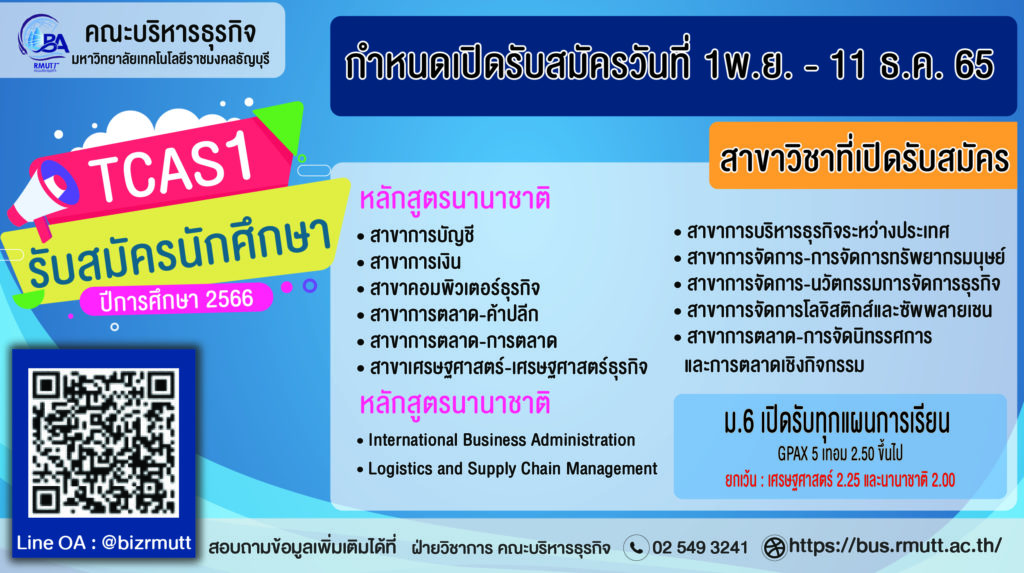 1.หลักสูตรภาษาไทย สาขาการตลาด-การตลาด, สาขาการตลาด-การตลาดค้าปลีก, สาขาการตลาด-การจัดนิทรรศการและการตลาดเชิงกิจกรรม, สาขาการจัดการ-การจัดการทรัพยากรมนุษย์, สาขาการจัดการ-นวัตกรรมการจัดการธุรกิจ, สาขาการบัญชี, สาขาการเงิน, สาขาเศรษฐศาสตร์-เศรษฐศาสตร์ธุรกิจ, สาขาคอมพิวเตอร์ธุรกิจ, สาขาการบริหารธุรกิจระหว่างประเทศ, สาขาการจัดการโลจิสติกส์และซัพพลายเชน