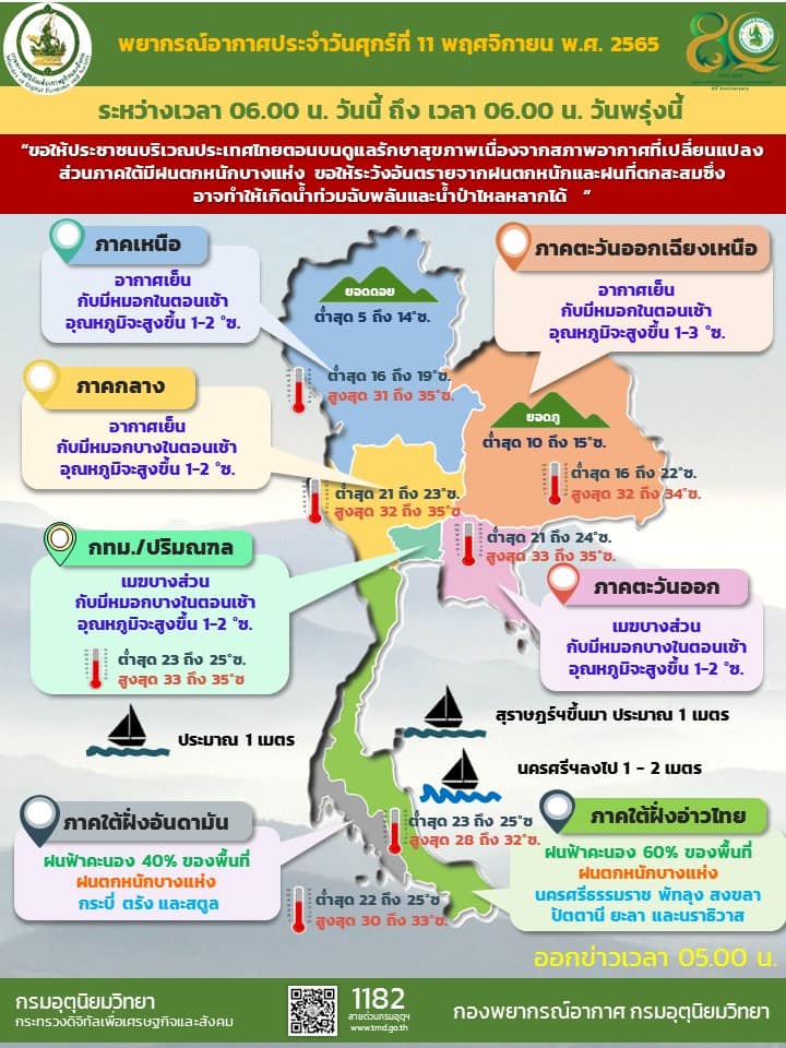 08.00 กรมอุตุฯ เผยประเทศไทยตอนบนอากาศเย็น ส่วนภาคใต้ยังคงมีฝนตกหนัก กรุงเทพและปริมณฑล อุณหภูมิจะสูงขึ้น 1-2 องศาเซลเซียส